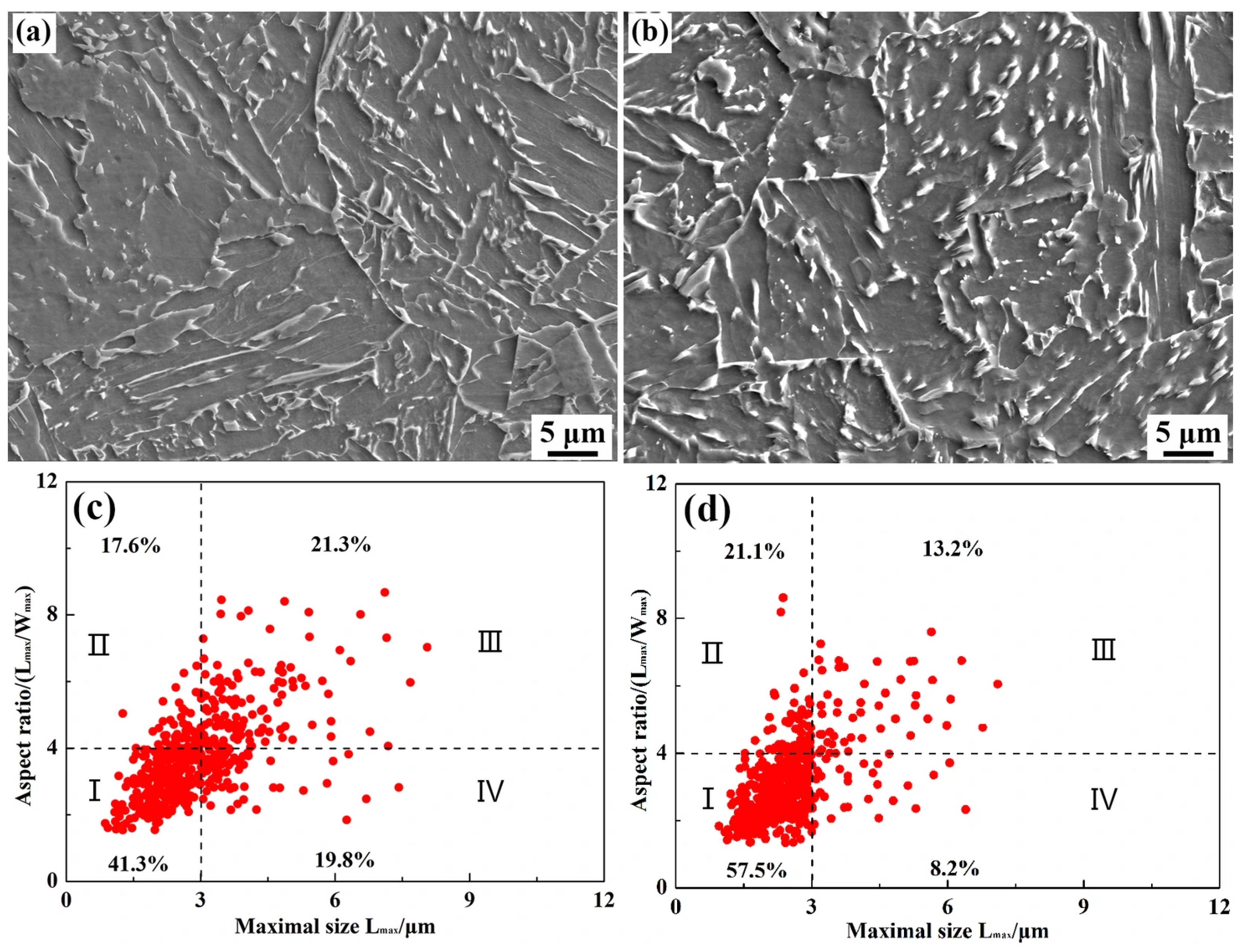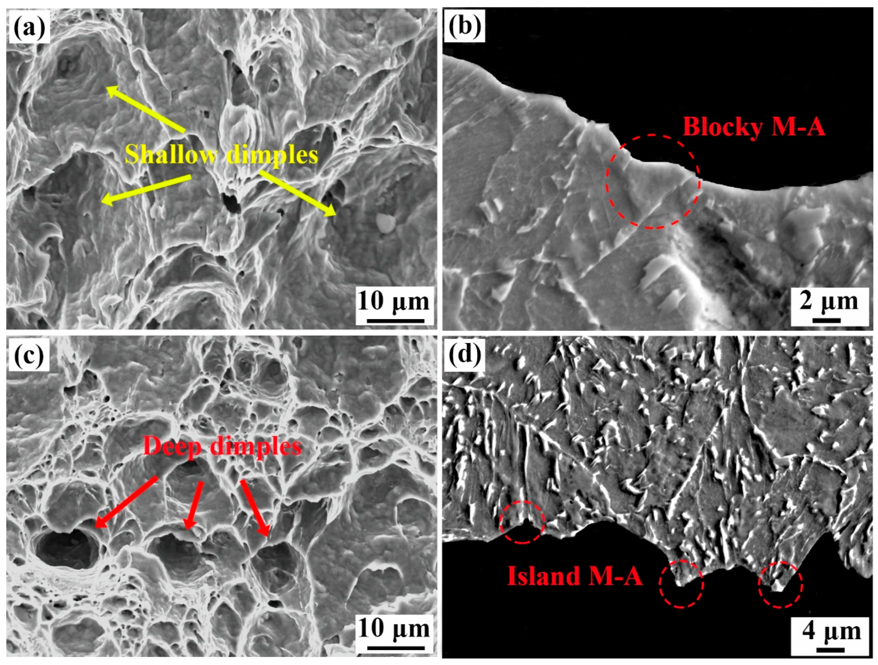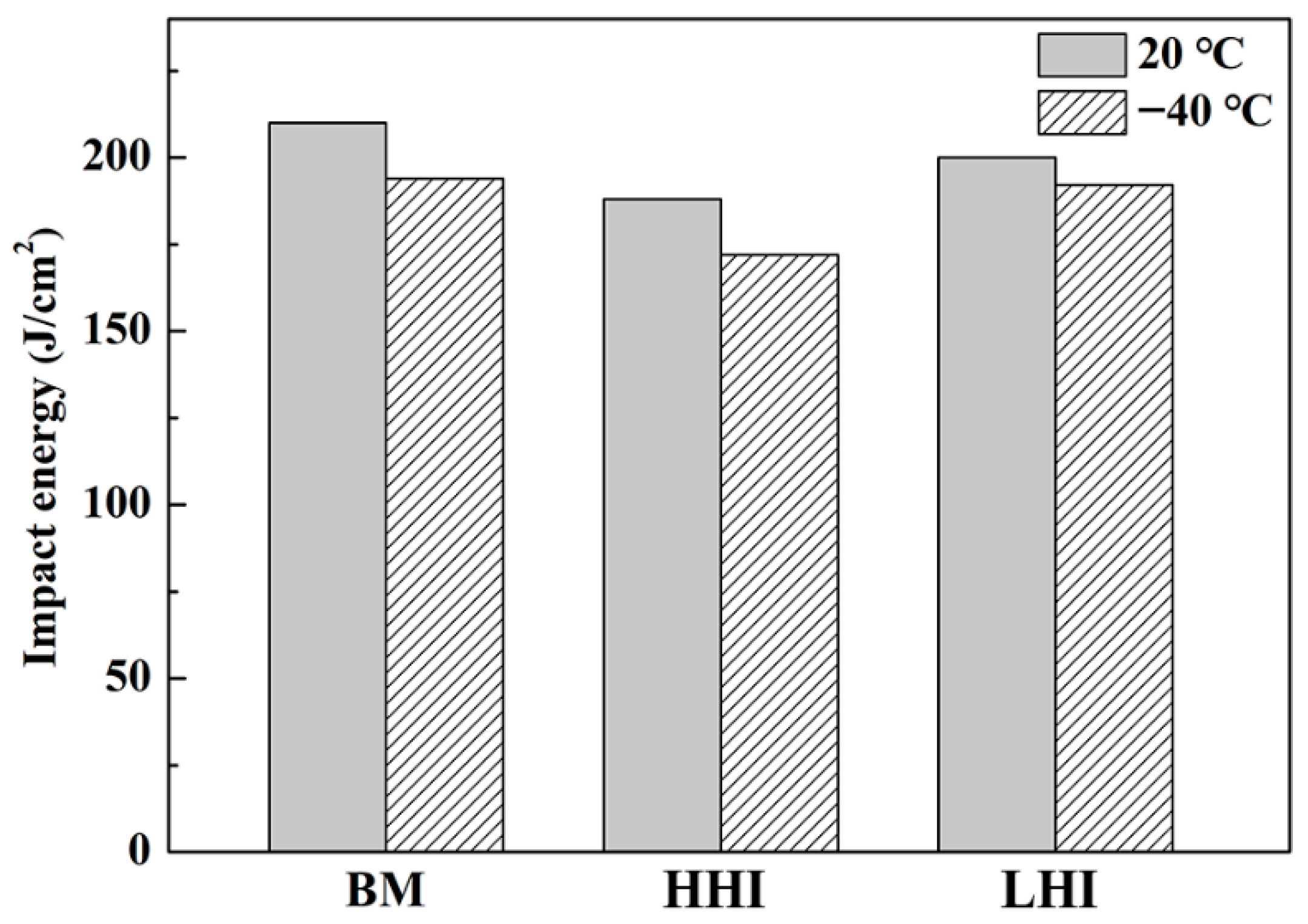 - An excellent toughness value of 200 J, representing 95.3% of the basal metal (BM), was achieved in the NZ at LHI. This is attributed to the fact that a high proportion of effective grain boundaries and fine M-A constituents can effectively arrest and deflect the crack propagation, enhancing the toughness.