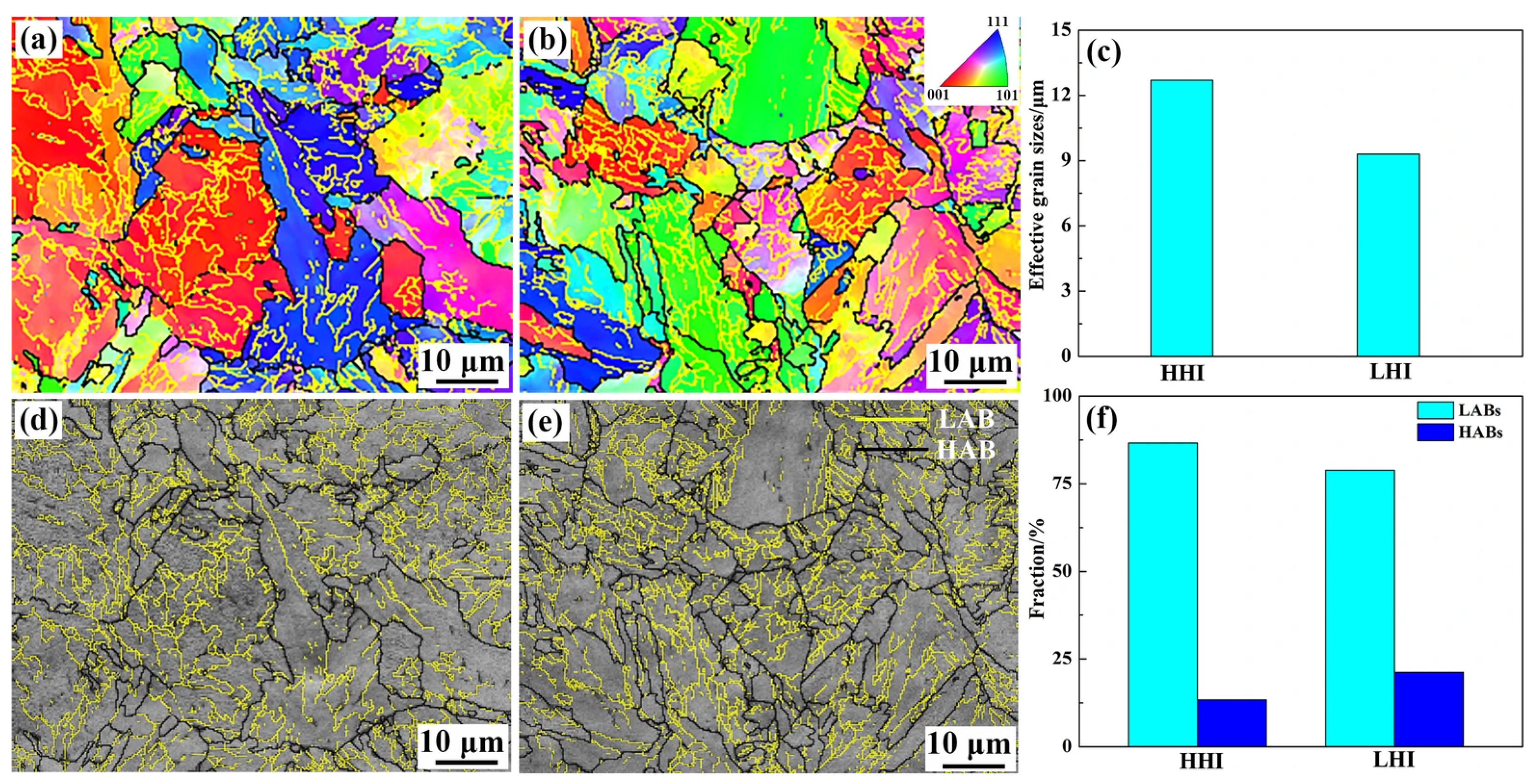 - Coarse granular bainite (GB) appeared in the NZ at high heat input (HHI), while fine GB and lath bainite (LB) were observed in the NZ at low HI (HHI). Meanwhile, there was a marked reduction in effective grain size within the NZ at LHI, and a significant increase in the ratio of refined M-A constituent was observed.