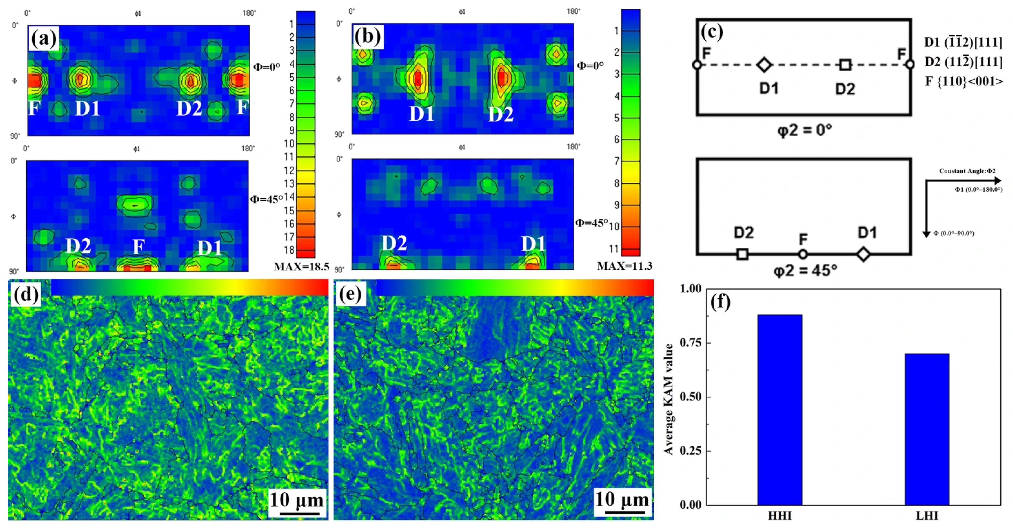 - Different types of shear textures such as D1, D2, and F were generated in the NZ under various HIs. Furthermore, the decreased HI leads to weak texture component accompanied by a decrease in the kernel average misorientation (KAM) value.