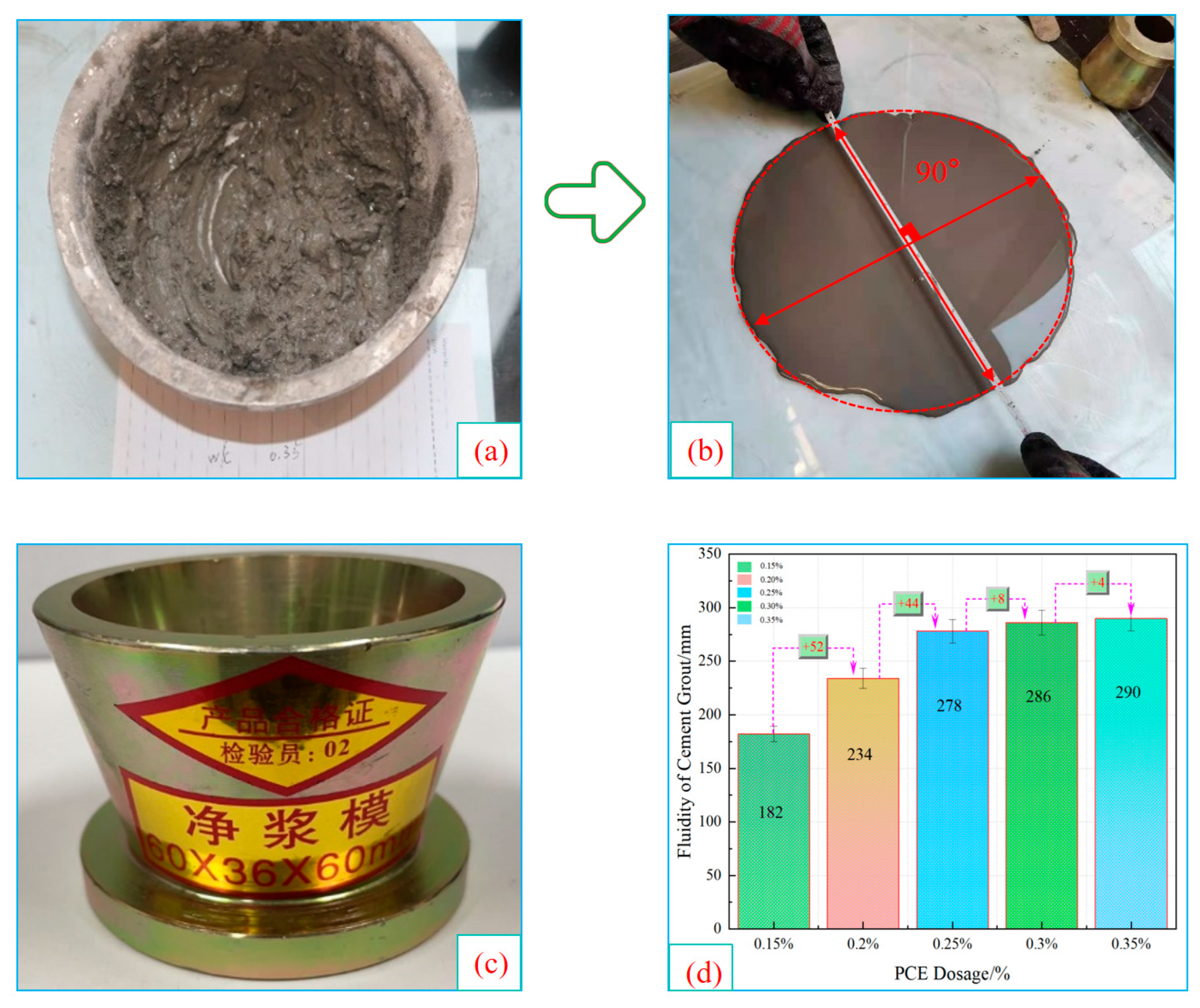 - The optimal PCE dosage was determined to be 0.25%, at which the SPC slurry exhibited a fluidity of 273 mm. The initial and final setting times were recorded at 268 min and 310 min, respectively, confirming that PCE serves as an effective plasticizer and set retarder.