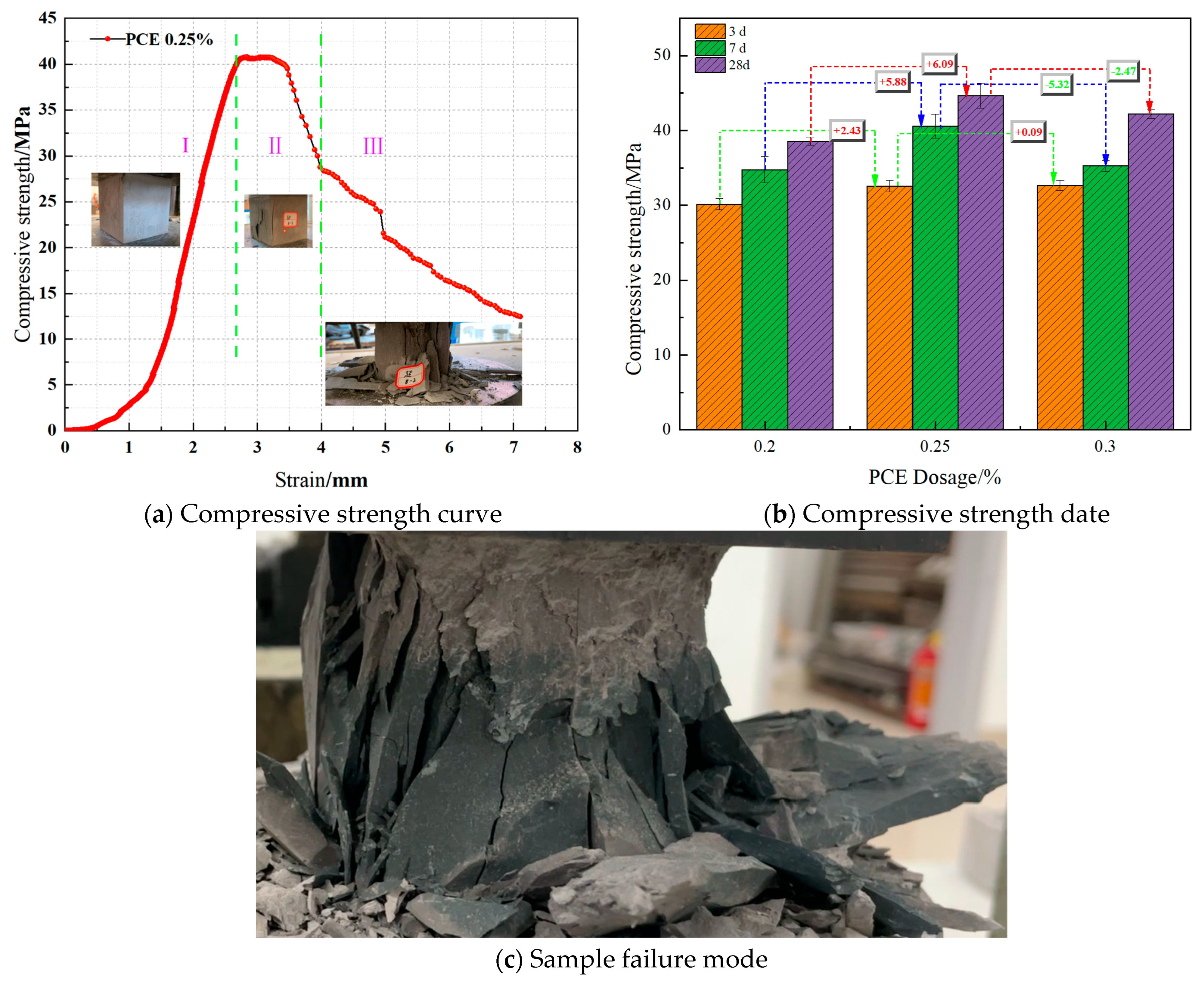- The PCE content of 0.25% significantly improved the long-term mechanical properties, resulting in 28-day compressive and flexural strengths of 44.65 ± 0.5 MPa and 7.1 ± 0.2 MPa. This represents a 15.79% increase in compressive strength and a 14.52% increase in flexural strength compared to the mixture with 0.20% PCE.