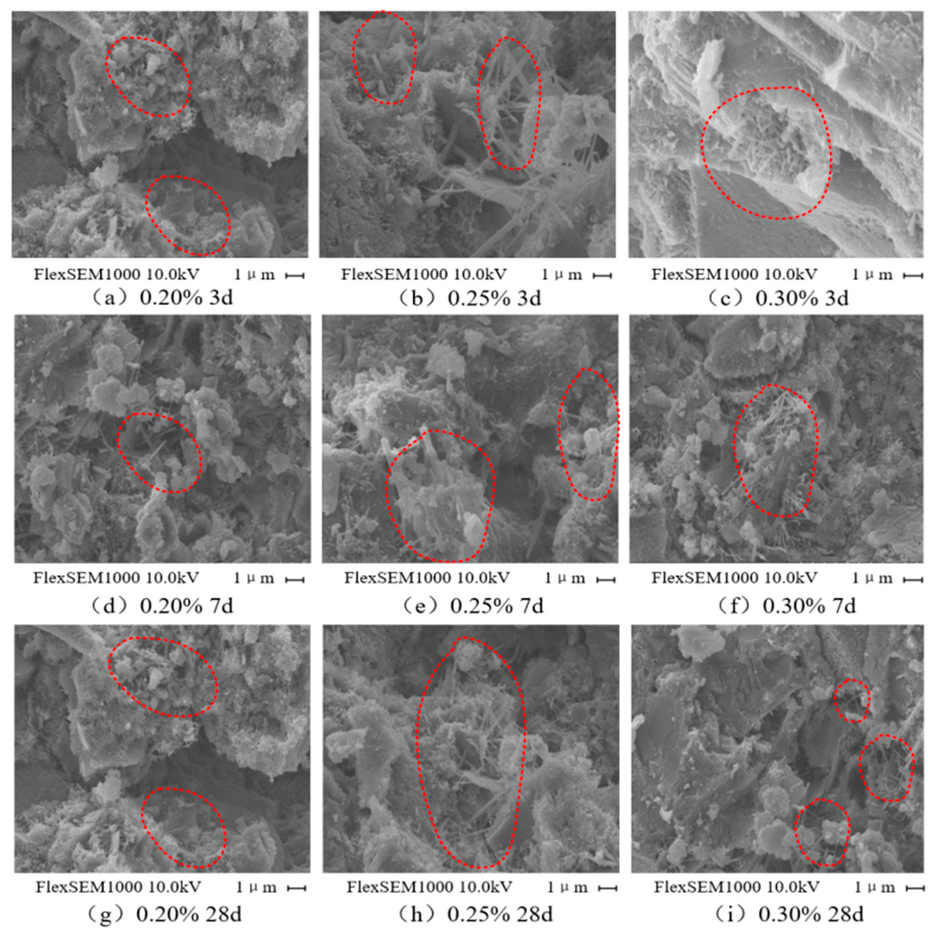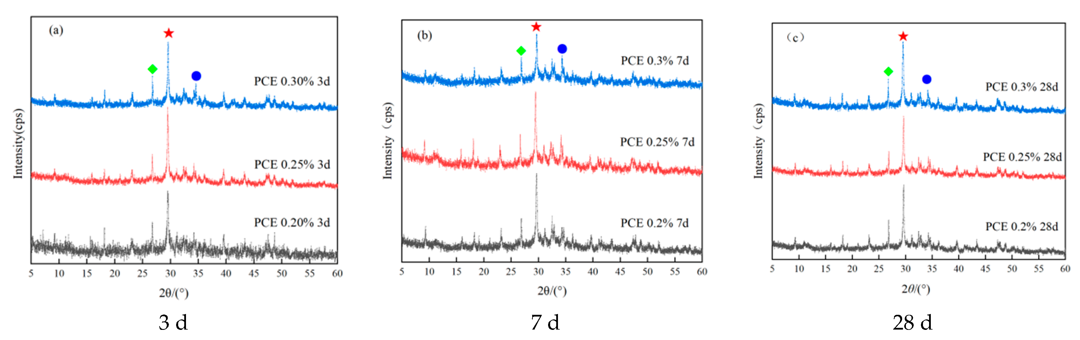 - SEM and XRD analyses elucidated the underlying mechanism, revealing that PCE influences the crystallization kinetics of ettringite (AFt). The optimal dosage promoted the formation of needle-like and rod-shaped AFt crystals, which contributed to a denser microstructure. A strong correlation was observed between the rate of crystal growth, the abundance of hydration products, and the resultant macroscopic mechanical strength.