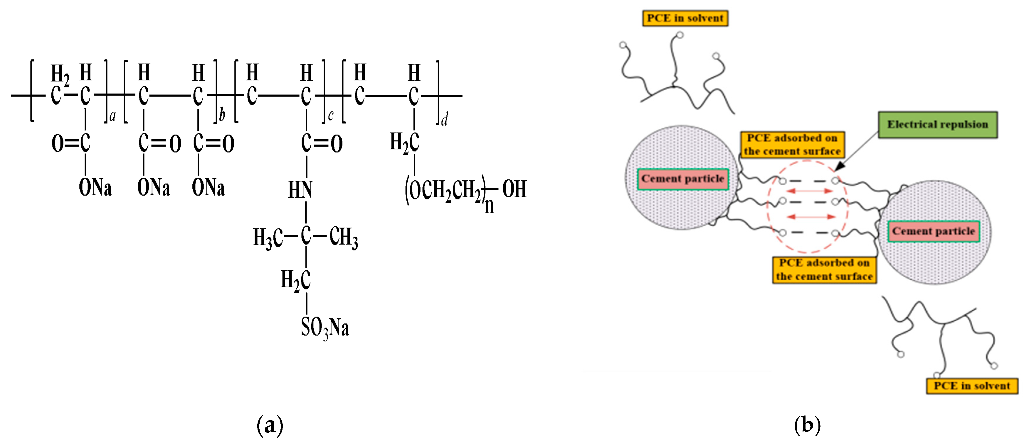 - Yang, Y.Z.; Tan, Y.; Li, Z.J.; Zhou, G.L.; Yu, X.M.; Xu, D.; Yong, Q.W.; Zhao, H.W.; Xie, Z.H. Interaction mechanisms between polycarboxylate superplasticizers and cement, and the influence of functional groups on superplasticizer performance: A review. Polym. Bull. 2024, 81, 10415–10438. [Google Scholar] [CrossRef]