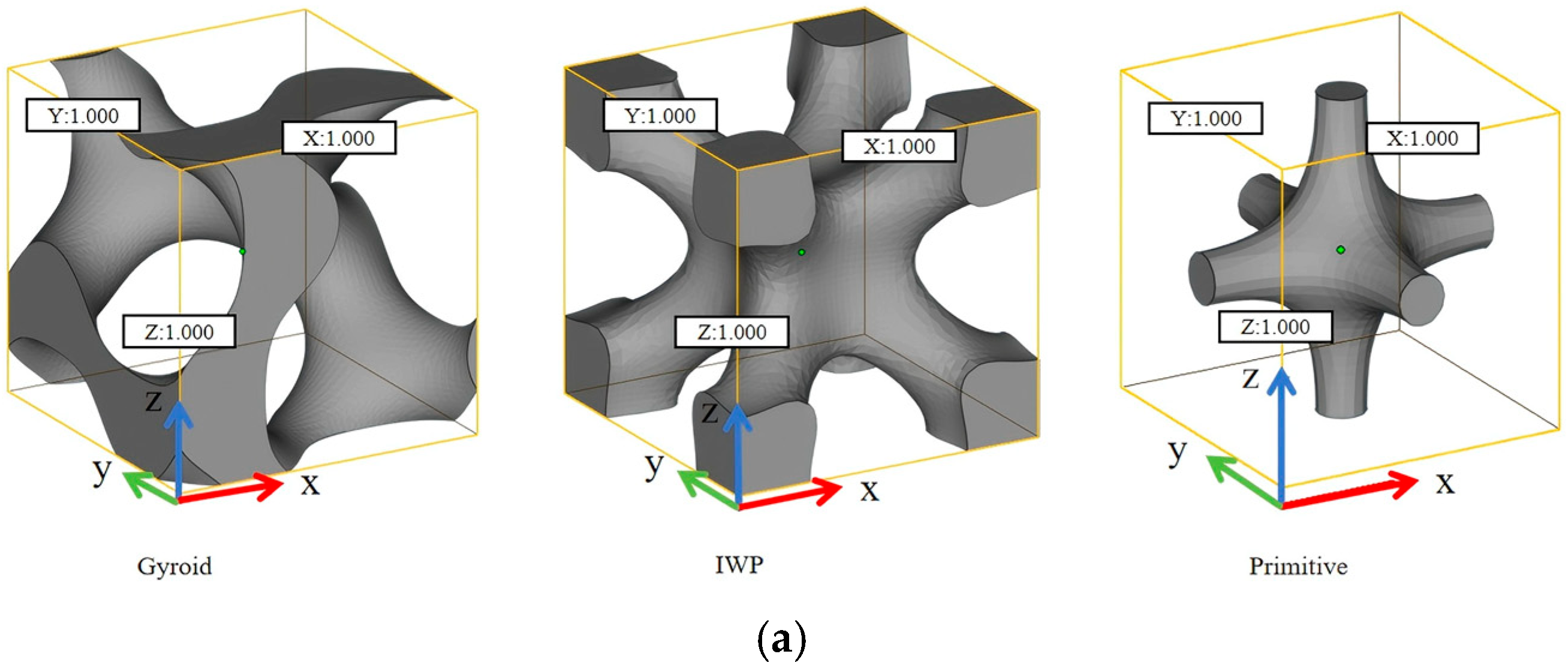 - Sharma, D.; Hiremath, S.S. Additively manufactured mechanical metamaterials based on triply periodic minimal surfaces: Performance, challenges, and application. Mech. Adv. Mater. Struct. 2022, 29, 5077–5107. [Google Scholar] [CrossRef]