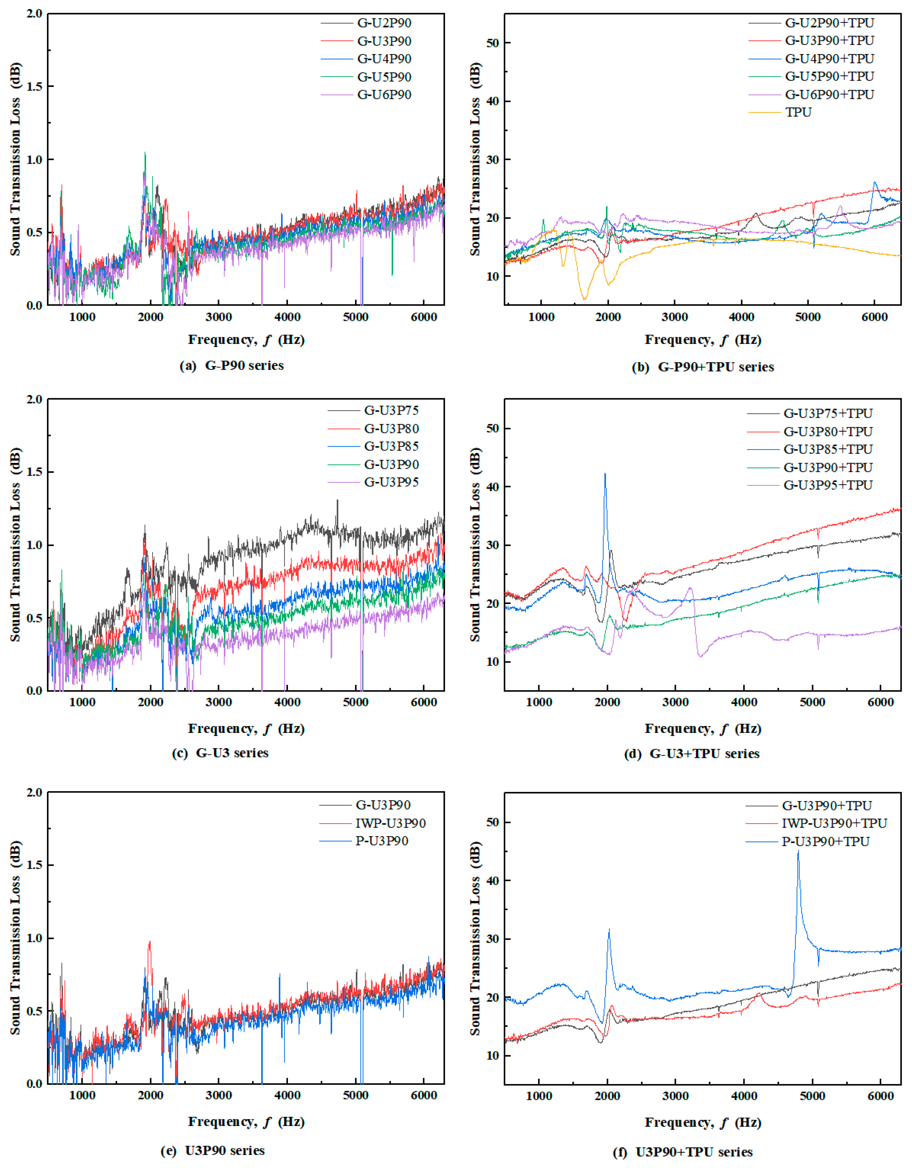 | Specimen No. | Weight (g) | TPU Mass Fraction(%) | Peak Transmission-Loss Frequency, fmax (Hz) | Maximum Normal Incidence Transmission Loss, TLmax (dB) | Average Normal Incidence Transmission Loss, TLave (dB) |