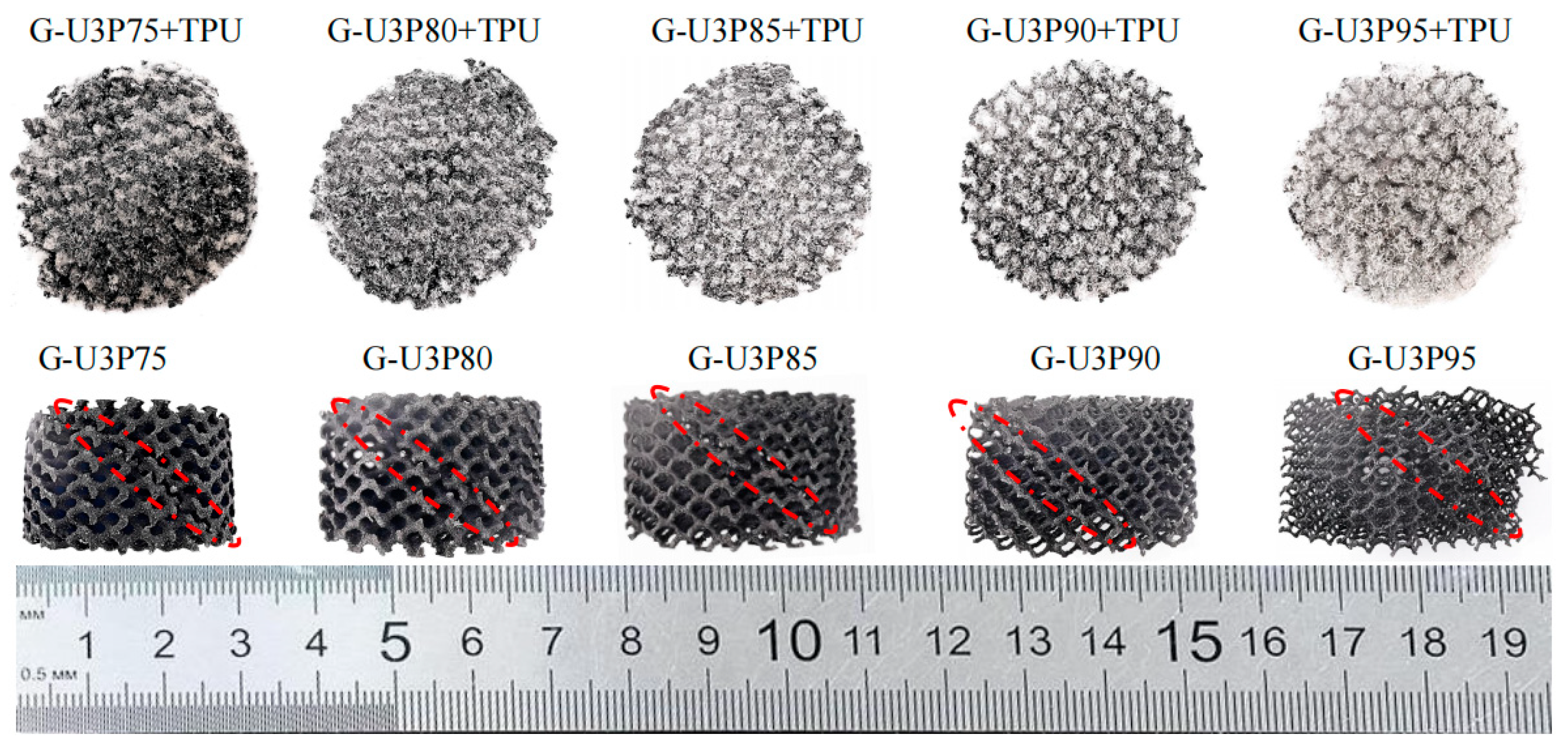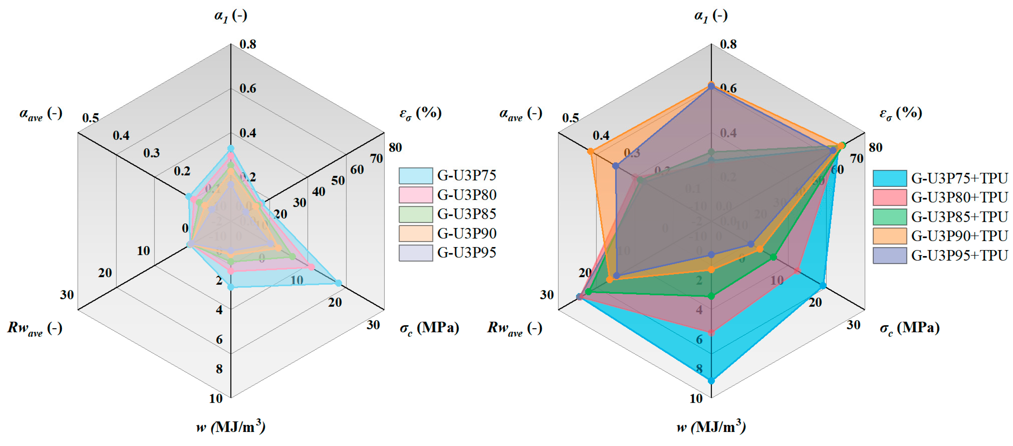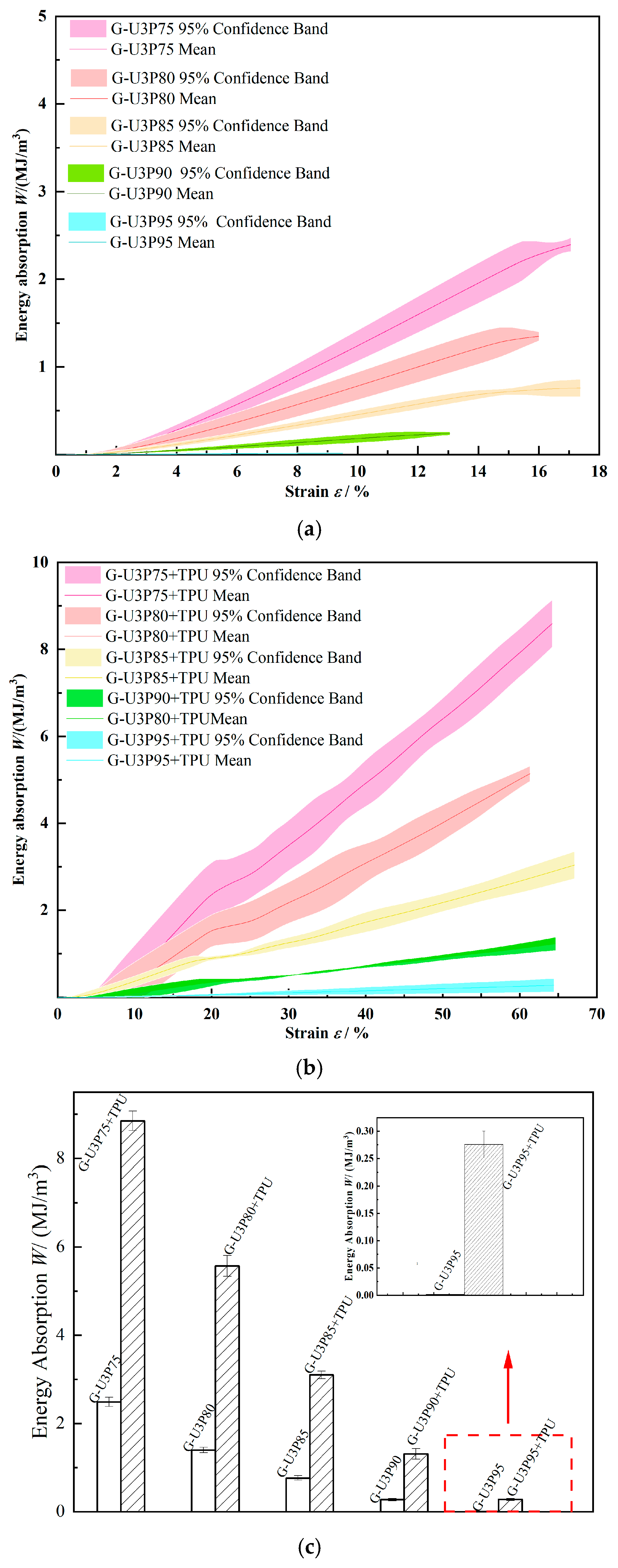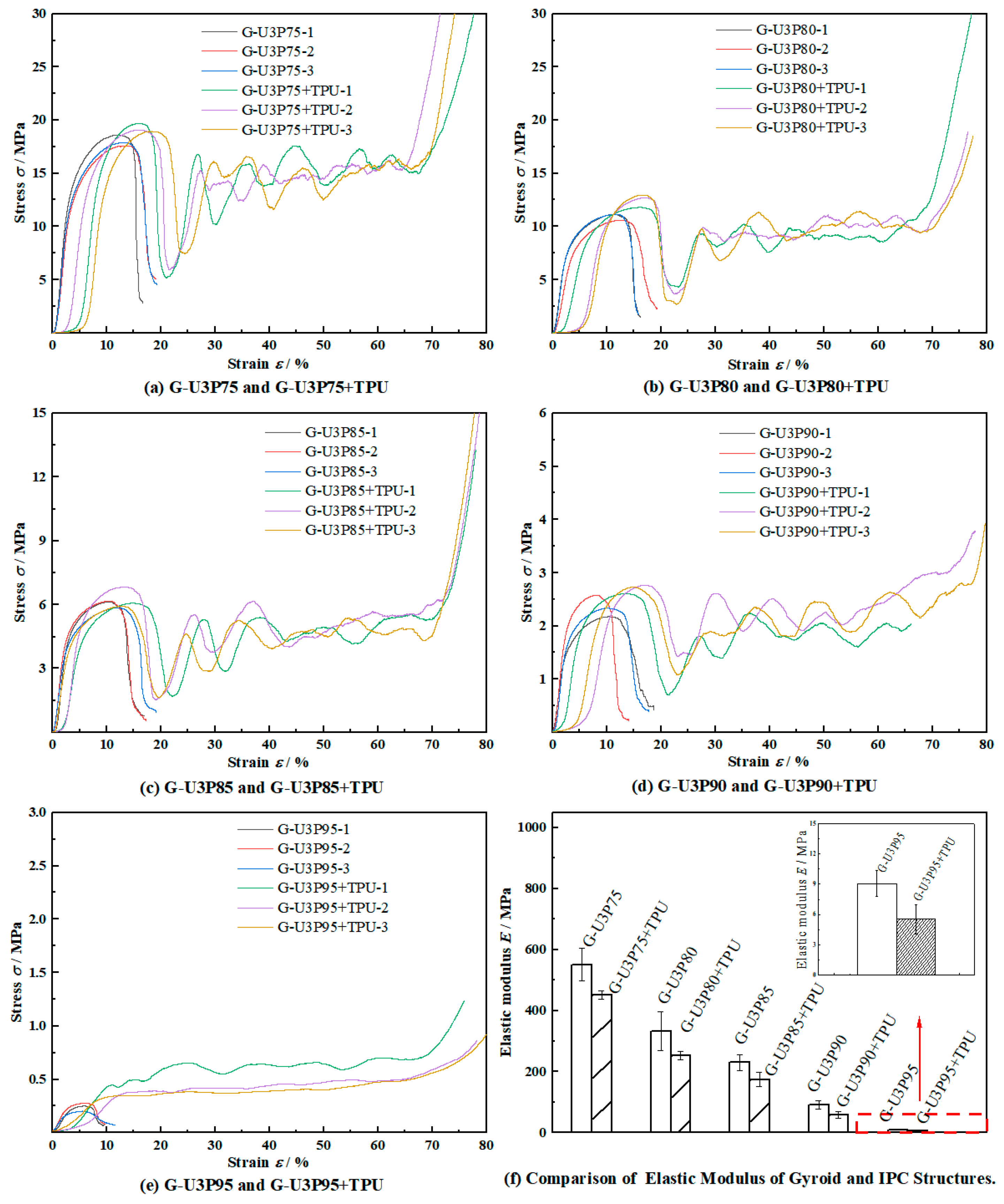 - It has been demonstrated that unfilled aluminum alloy gyroid structures exhibit abbreviated yield plateaus. Within the 75%–85% porosity range, compressive failure occurs at approximately 15% strain. This failure is primarily due to 45° shear-band brittle fracture. When porosity exceeds 85%, the failure mechanism transitions to localized brittle collapse. Specifically, at porosities greater than 90%, the compressive failure strain is reduced to approximately 8%, and the shear-band angles deviate to 60° ± 5°, a consequence of stress field distortion. Following TPU infiltration, the IPC structures develop ductile plateaus exceeding 60% strain under quasi-static compression, accompanied by substantial enhancement in energy absorption performance. G-U3P75+TPU demonstrated the best energy absorption characteristics, based on experimental data presented as mean ± 95% CI (n = 3).