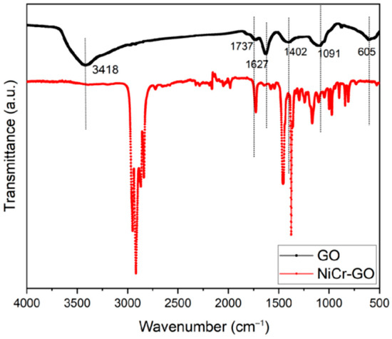 Infrared spectra of Ni/Cr-GO composite coating and GO.