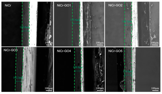 The microscopic cross-section results of NiCr and NiCr-GO1~NiCr-GO5 coatings were shown in Figure 3. It can be seen that the coating tightly bonded to the substrate without holes and gaps. The thickness of the NiCr and NiCr-GO1~NiCr-GO5 coatings was 118.0 μm, 115.8 μm, 110.2 μm, 102.3 μm, 108.0 μm, and 116.8 μm, respectively. Obviously, there was not much difference in the thickness, indicating that with the increase in graphene content in the coating, the thickness of the coating did not change after it was embedded in the coating, which proved that it was filled in the crystal structure defects, such as microcracks. This was consistent with the change in microcracks in the micro-surface morphology in Figure 3, which further proved that the microstructure was denser.