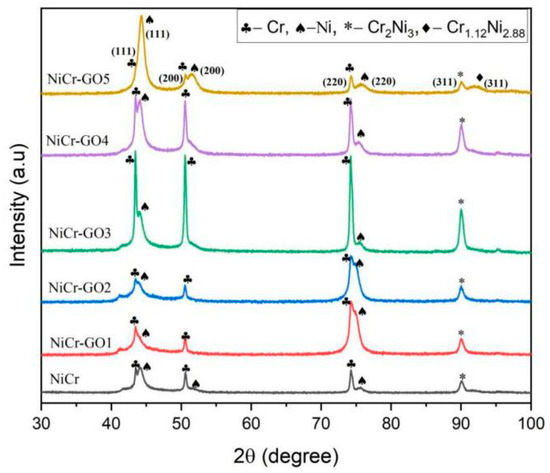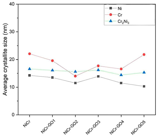 The crystallite size of the Cr phase decreased with decreasing GO content and fluctuated within a certain range. The size variation in Ni and Cr2Ni3 was small, and it can be considered that GO had a limited effect on the grain size of these two phases. The changes in grain size indicated that the physical and mechanical properties had been improved, which was mainly attributed to the heterogeneous nucleation and growth retardation/grain boundary pinning effect of GO sheets during electrodeposition [30].