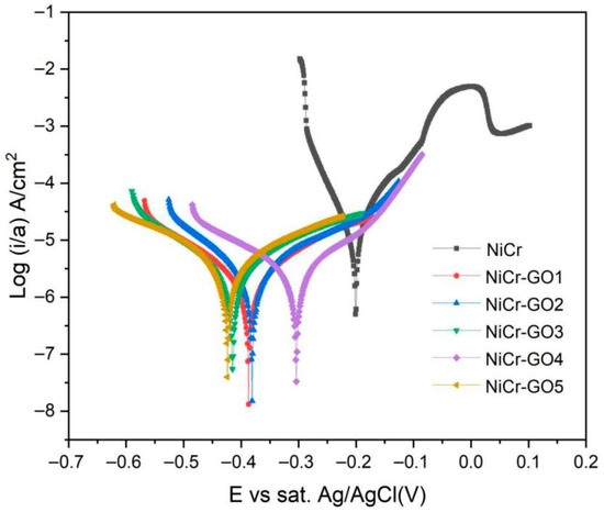 The polarization curves of NiCr and NiCr-GO1~NiCr-GO5 coatings were tested, respectively. The test solution was 3.5 wt% NaCl solution. The test solution was stabilized for 30 min before the test to obtain a stable open circuit potential (OCP). The polarization curve results of different samples were shown in Figure 6. No passivation behavior was observed in the anodic polarization curve, which reflected that metal ions were continuously dissolved into the solution and limited or did not form stable metal hydroxides and oxides.