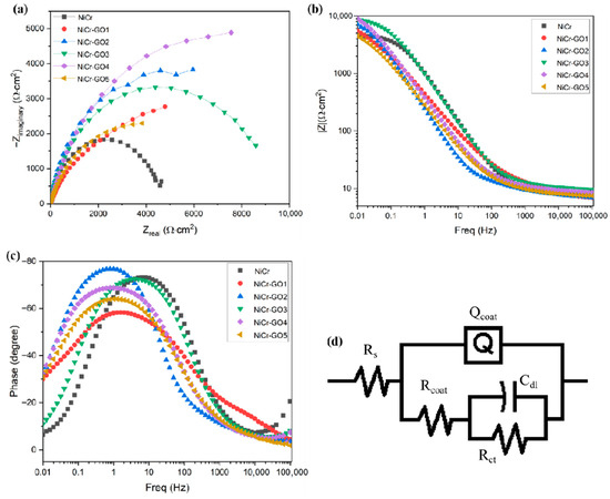 (a): Nyquist diagram of NiCr and NiCr-GO composite coatings; (b,c): Bode diagram of NiCr and NiCr-GO composite coatings; (d) electrochemical equivalent circuit (EEC) simulating EIS data.