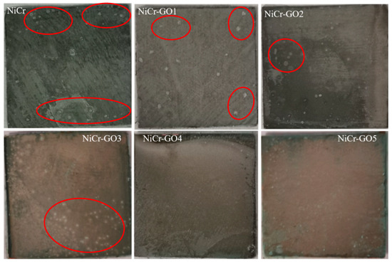 In order to understand the long-term corrosion resistance of the coating, the NiCr coating and NiCr-GO composite coating samples were subjected to a 20-day full immersion test in 3.5 wt% NaCl solution. Figure 8 was the macroscopic view of the coating after 20 days of immersion. The red circles indicated the corrosion points on the coating. It can be seen from the figure that after 20 days of corrosion immersion, the corrosion points on the surface of the nickel–chromium coating were densely distributed, indicating that the coating has been seriously corroded at this time. Compared with NiCr coating, the corrosion degree of NiCr-GO composite coating was shallow, and with the increase in GO, the corrosion resistance was gradually enhanced. Until the addition amount of GO was 0.750 g/L, there was no corrosion on the surface of the coating, and only green products existed on the edge. It was mainly due to the edge effect that the edge of the coating was loose and rough, which leaded to the corrosion of the solution. Continue to increase the GO content, the green corrosion products diffused from the edge to the center, indicating that excessive GO agglomeration made the coating uneven, so that GO did not play a good protective role [32].