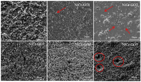 Figure 2a showed the micro-morphology of NiCr, NiCr-GO1, NiCr-GO2, Ni Cr-GO3, NiCr-GO4, and NiCr-GO5 coatings. The red arrows indicated the positions of microcracks within the coating, and the white lines denoted the microcracks within the coating. The surface of the coating was uniform and densely packed. The microcracks in the coating showed the characteristic micro-morphology of metal chromium deposition. Microcracks were the result of stress release in the coating. At the same time, the existence of microcracks reduced the residual stress of the coating.