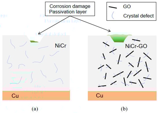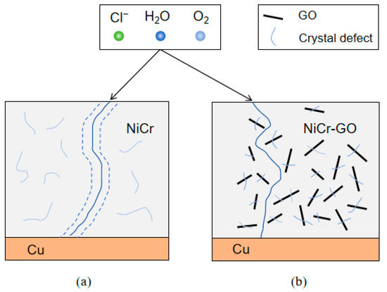 The corrosion path of NiCr-GO was shown in Figure 10. Firstly, GO was embedded into the metal coating by electrodeposition, showing a single layer of flakes, mainly distributed in crystal defects, such as microcracks, which effectively reduced the porosity, made the coating denser, and the corrosion solution was not easy to penetrate. At the same time, the appropriate amount of GO improved the cracks in the coating structure, resulting in an optimal balance between cracks and corrosion resistance. Secondly, when the flake GO coated on the surface of the substrate metal, a physical barrier formed on the surface of the coating. According its high chemical inertness and impermeability, the barrier played a protective role and delayed the corrosion process when it was eroded by the corrosion solution [33]. Compared with NiCr coating, due to the superposition of flake GO in NiCr-GO coating, the invasion path of corrosion solution was greatly increased, which can effectively prevent the immersion of corrosion substances for a long time, thus protecting the matrix metal.
