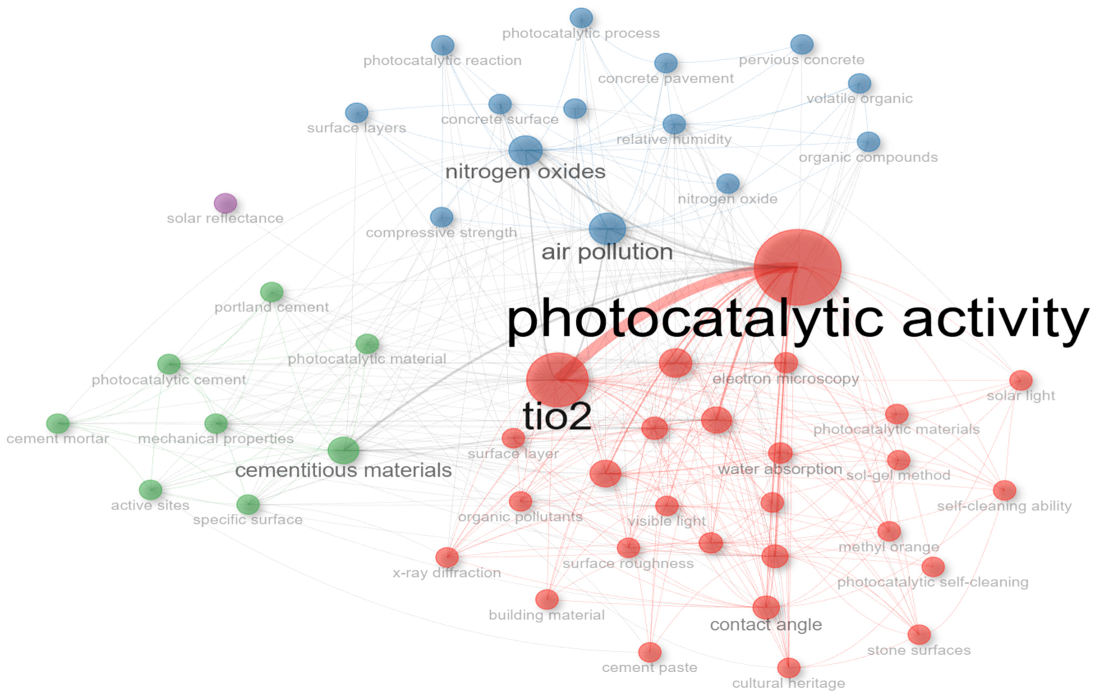 | 3 | Adhesion mechanism, visible light photocatalysis, aging, BiVO4, agglomeration control | 15 | 0.247 | 2.07 | - Low centrality but high impact - Opportunities for innovation, especially in mechanistic studies, durability under real conditions, and visible-light-active photocatalysts. |