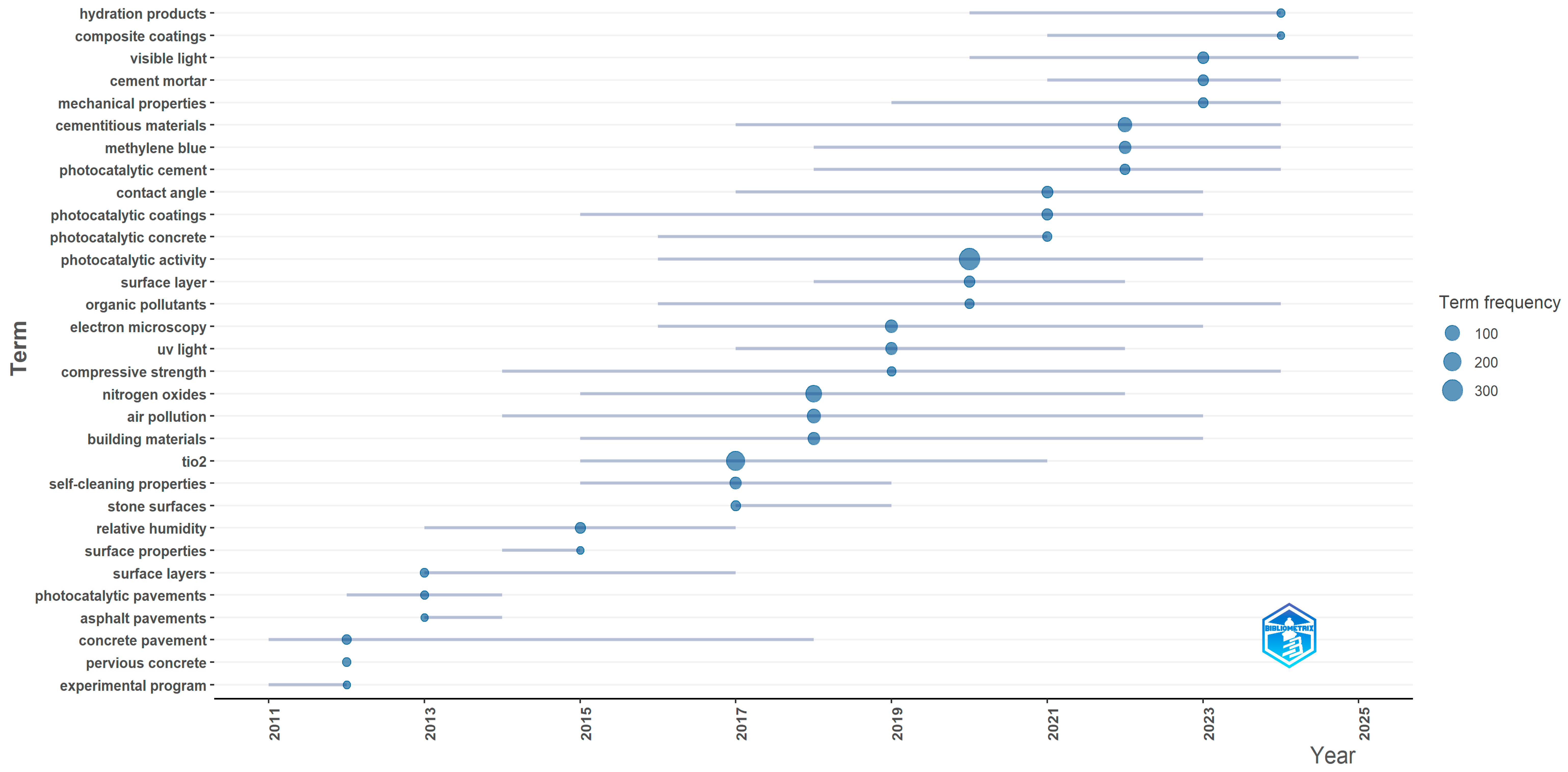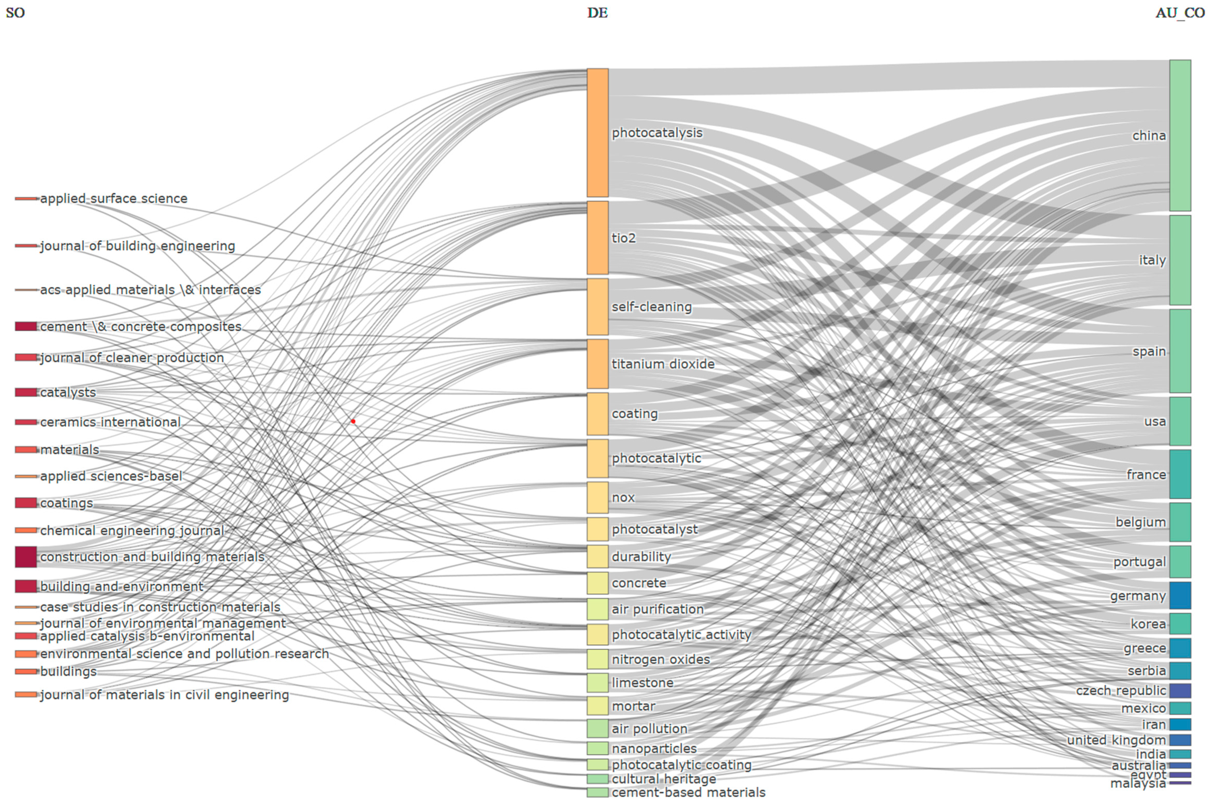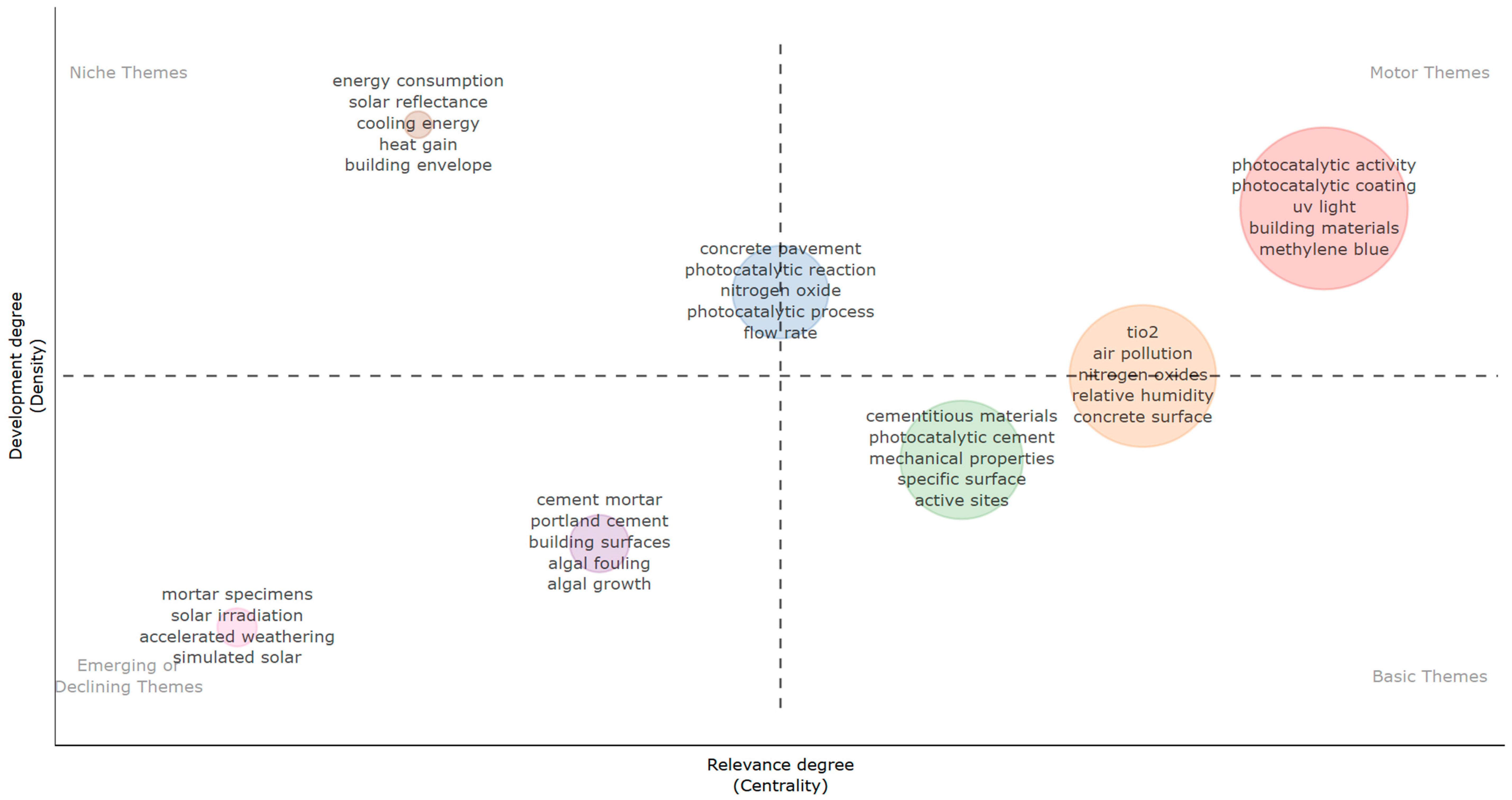 | 1 | Self-cleaning, coating, limestone, cultural heritage, durability, biocide | 54 | 0.596 | 1.92 | - High centrality & good impact - Core applications of photocatalytic coatings in construction, especially heritage conservation and durability enhancement. - Researchers should continue exploring practical, real-world uses |