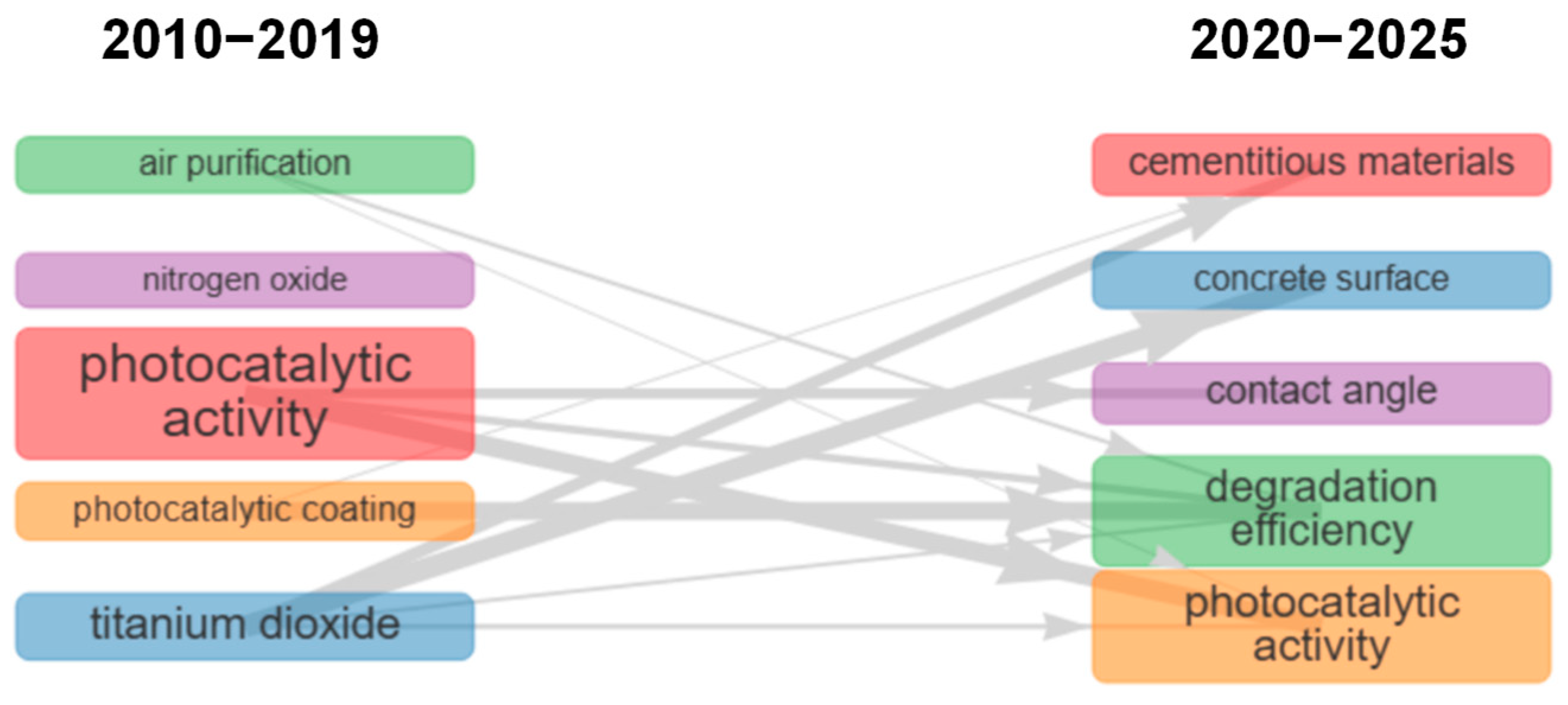 | Hassan et al., Constr Build Mater 2010 [23], | Titanium dioxide; sustainable concrete pavement construction; photocatalyst; nitrogen oxides | 186 | 25 | Abrasion and wear resistance properties of TiO2 coatings on concrete pavements, and NOx removal efficiency of coatings |