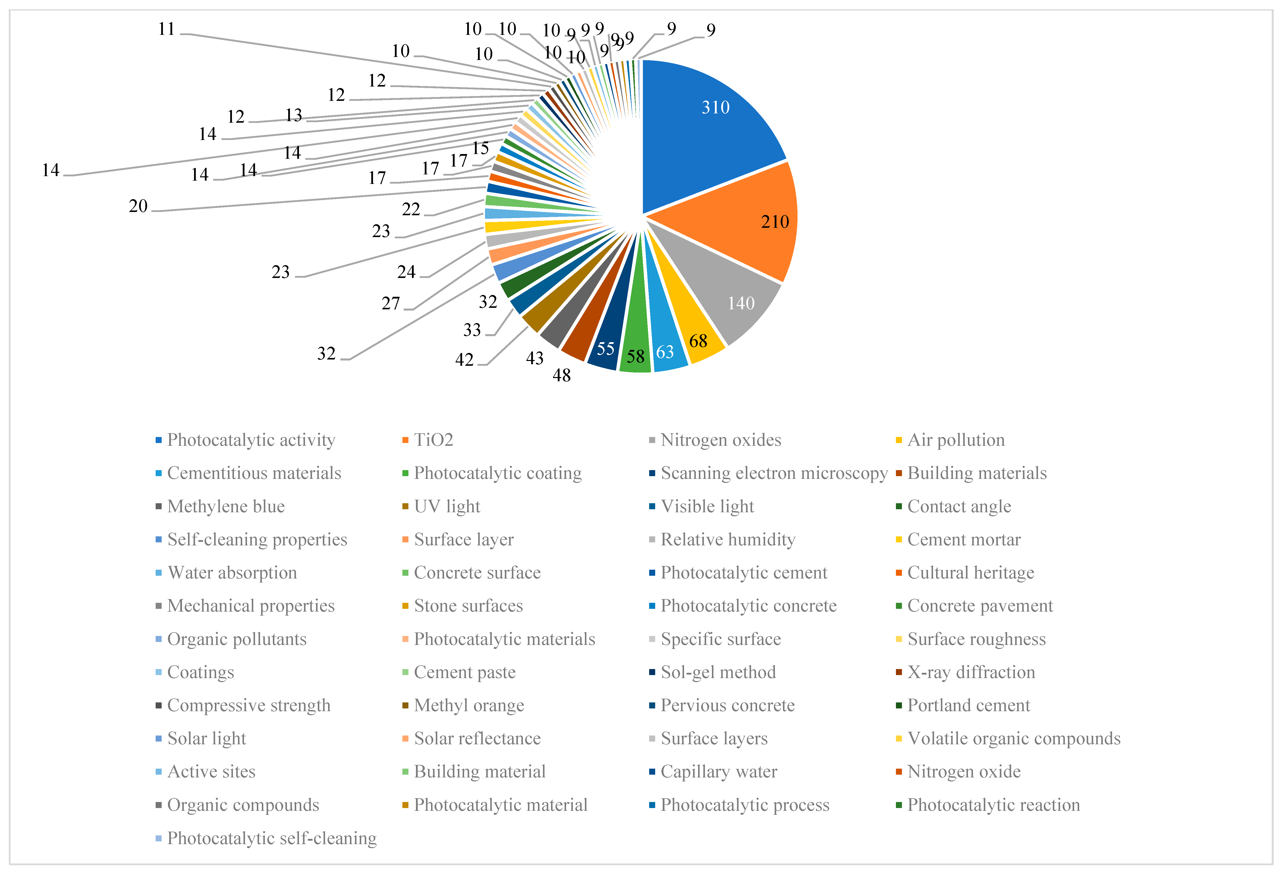 | Methylene blue | 43 | [36,37,38,55] | Photocatalytic cement | 20 | [26,27,30,75] | Cement paste | 12 | [10,40,75] |
