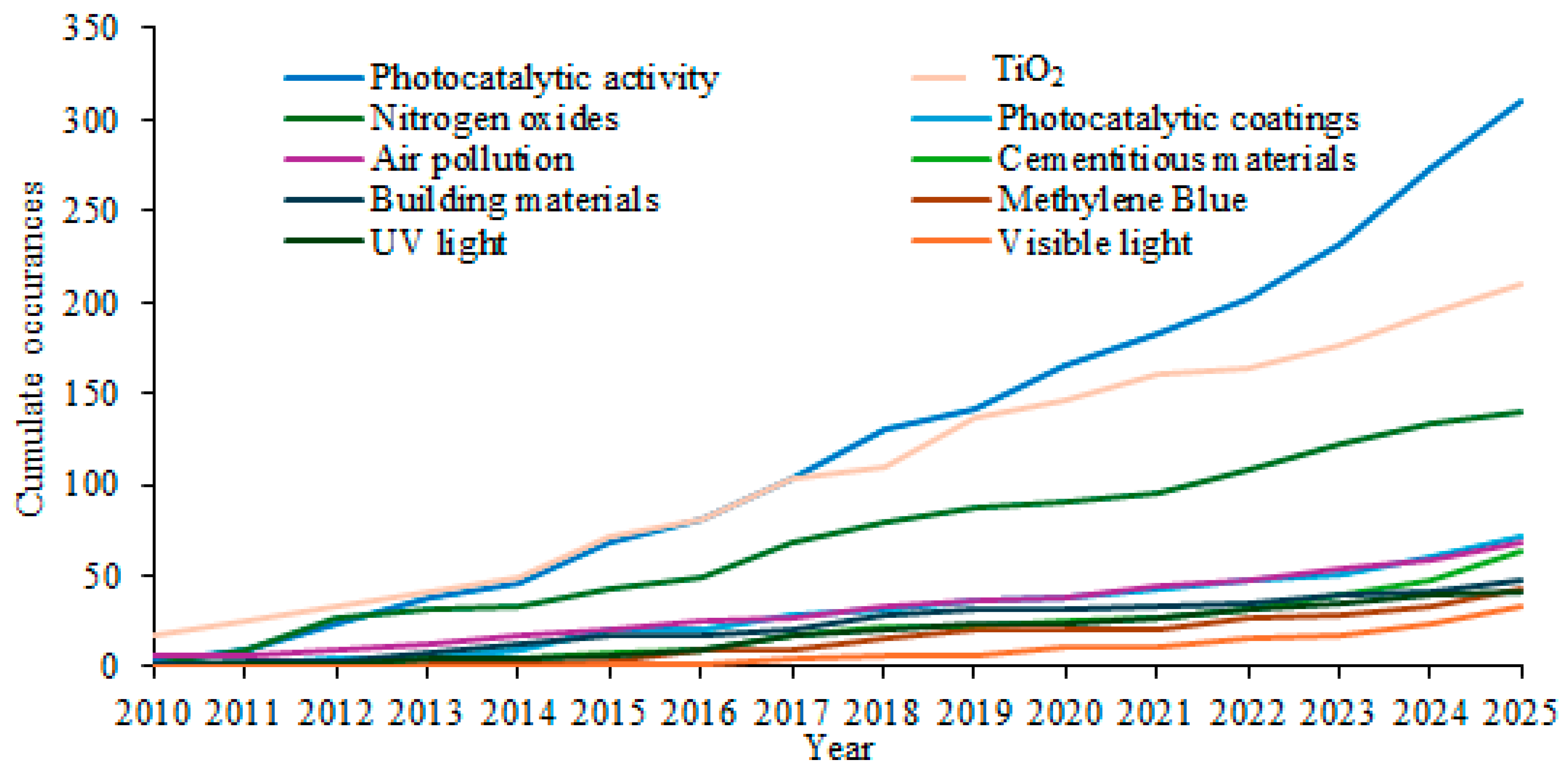 | Ramirez et al., Build Environ 2010 [25] | Heterogeneous photocatalysis; titanium dioxide; cementitious materials; toluene; volatile organic compounds; air purification | 163 | 30 | Comparison of air purification potential (toluene removal efficiency) of dip-coated and sol–gel coated TiO2 enriched concrete samples, and weathering resistance of the TiO2 coatings loaded on cementitious materials |