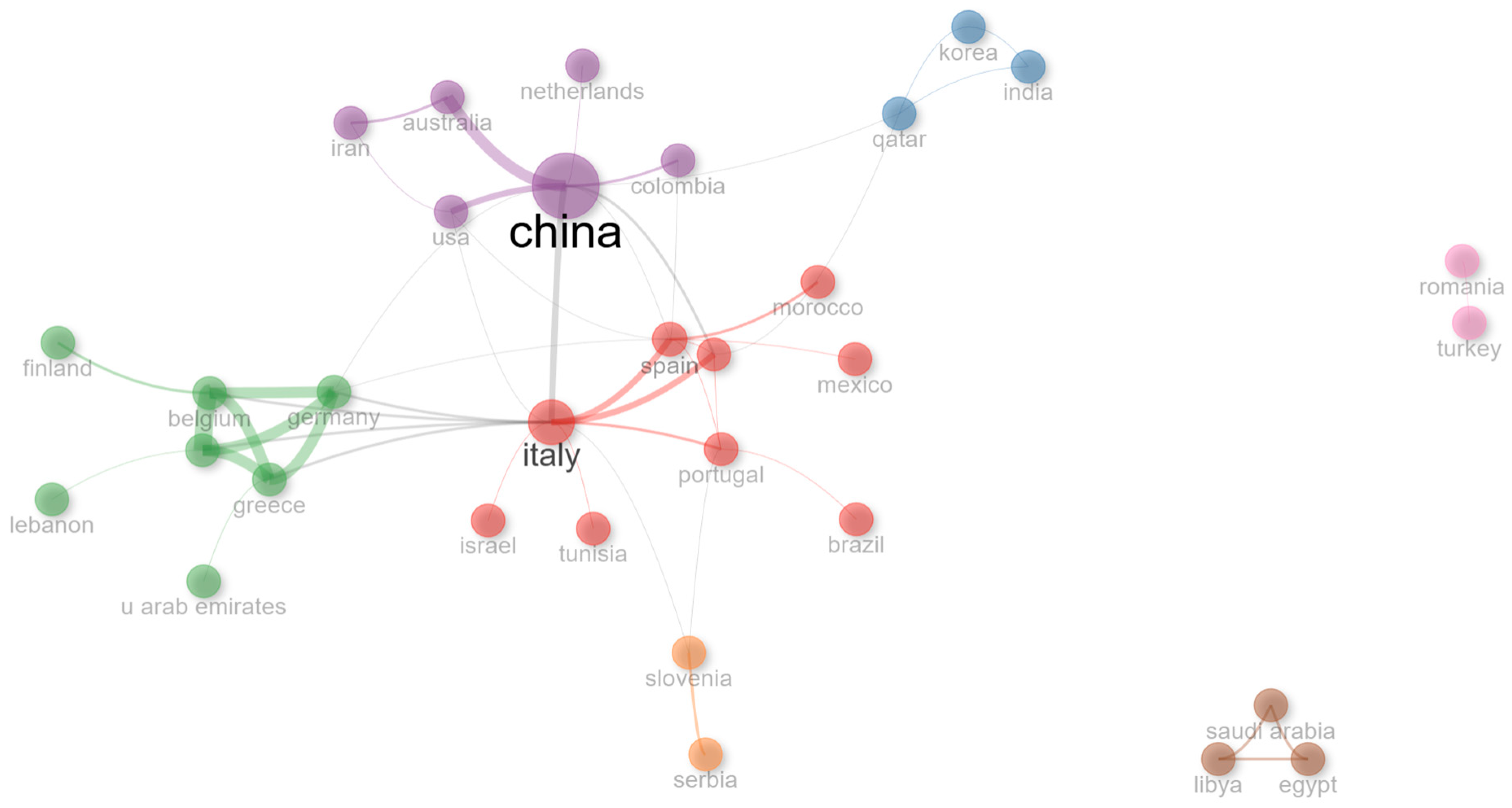 3.5. Social Structure: Collaboration Network and Country Collaboration World Map