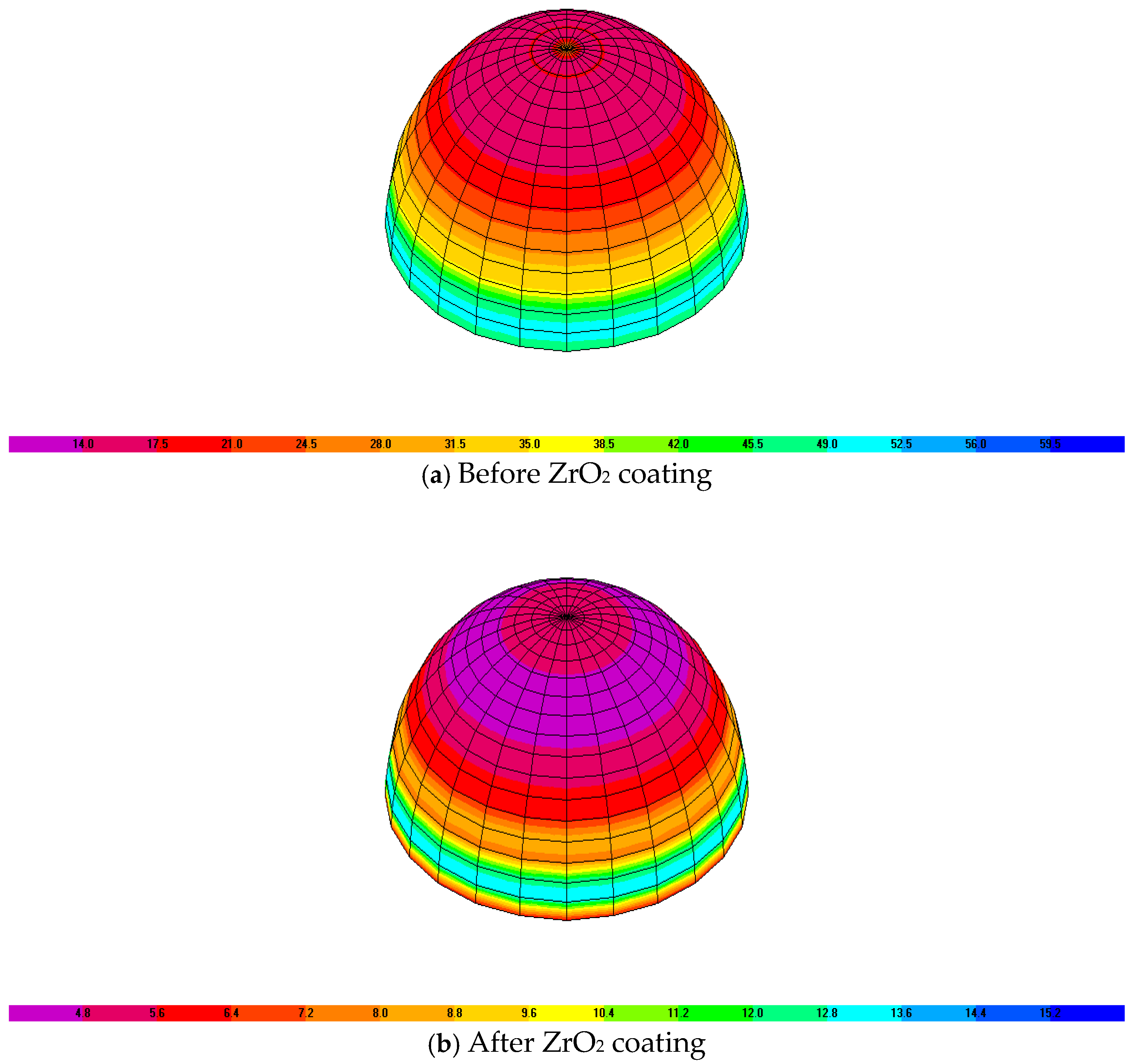 - Enhanced structural rigidity: ZrO2 coating increased natural frequencies from 54.82–68.25 Hz to 112.35–146.41 Hz, indicating improved stiffness without significant mass addition.