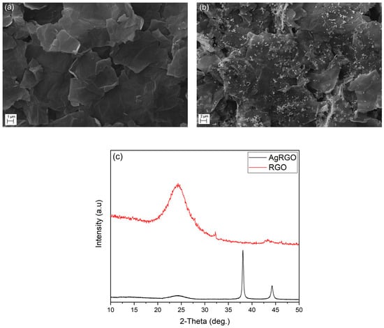 SEM micrographs of (a) RGO, (b) Ag/RGO powders, and (c) XRD analyses taken from RGO and Ag/RGO powders. The Ag/RGO ratio is 5 w/w.
