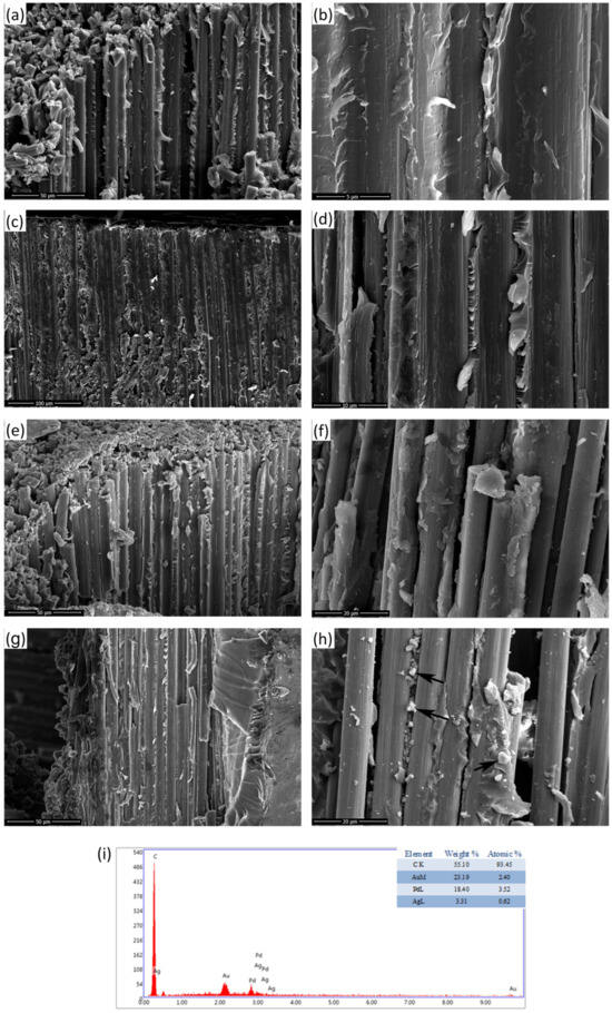 SEM micrographs of (a,b) neat and carbon fiber composites containing (c,d) 0.075 RGO, (e,f) 0.26 AgRGO, and (g,h) 0.45 AgRGO, and (i) corresponding EDX analysis. Accumulated AgRGO particles at the CF interfaces, as indicated by black arrows in (h).