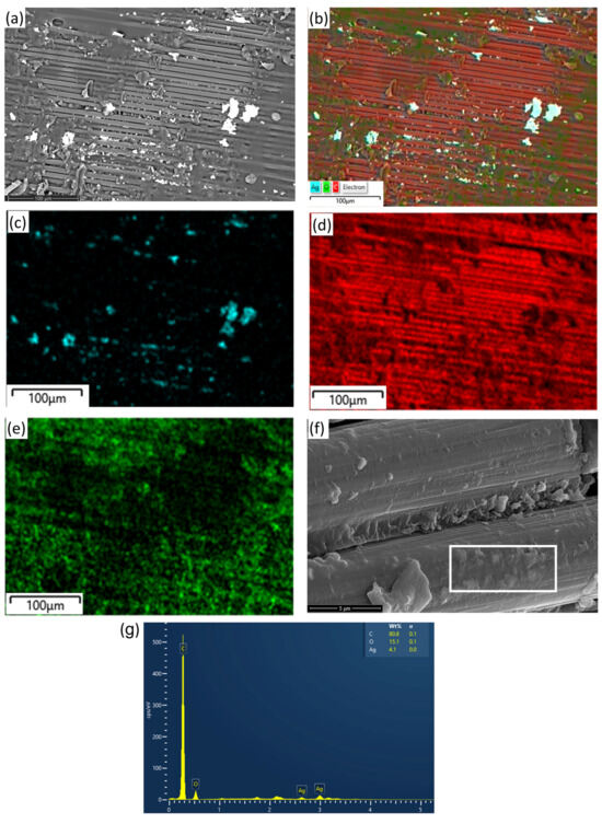 Energy dispersive X-ray (EDX) Elemental mapping was performed on a 0.45AgRGO composite sample to examine the distribution of AgRGO fillers on carbon fibers. The full area of the SEM image depicted in Figure 4a was investigated for distributions of Ag, C and O see Figure 4c–e; a superimposed phase distribution map is shown in Figure 4b. EDX mapping data for elemental analysis indicates that silver (Ag) is distributed across the CF surfaces and interfaces. Some agglomerated AgRGO particles are also present on the CF surfaces. Elemental mapping from the 0.45AgRGO/CF composite confirms the presence of Ag/RGO clusters in certain regions, as shown in Figure 3h.