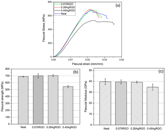 Figure 5 shows the flexural stress–strain, flexural strength, and modulus of neat carbon fiber, RGO, and AgRGO-containing carbon fiber composites. The flexural stress–strain curves of the neat and 0.075RGO, 0.26AgRGO and 0.45AgRGO composites are presented in Figure 5a. According to the stress–strain response curve of the composites (Figure 5a), the flexural stress linearly increased with strain at the beginning of the tests for all samples. The curve of the 0.26 AgRGO composite exhibited a slightly higher slope prior to catastrophic failure in comparison with the curve of the neat composite. Moreover, the 0.45 AgRGO composite exhibits the lowest stress level. Figure 5b shows the flexural strength curves of the neat and composite samples. The flexural strength of the composites increased slightly from 689 MPa for neat composite to 701 MPa and 703 MPa with the addition of 0.075 RGO and 0.26 AgRGO composites, respectively.