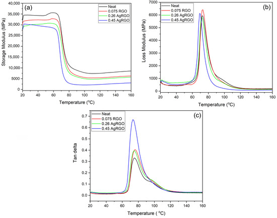 Variation of (a) storage modulus, (b) loss modulus, and (c) tan delta for neat and RGO & AgRGO CF composites as a function of temperature.