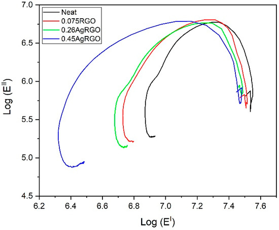 The Cole-Cole graph (Figure 8) was used to analyze the distribution of the RGO and AgRGO coating materials within the carbon fiber composite, as well as the homogeneity of the composite system, by plotting the loss modulus (E″) and storage modulus (E′) on a logarithmic scale. The shapes of the curves in the Cole-Cole graph can be used to determine whether the system is homogeneous or heterogeneous. In other words, a homogeneous system with good epoxy-CF adhesion exhibits semicircular, smooth curves, while a defective or irregular shape represents a two-phase heterogeneous system [30]. As can be seen from the Cole-Cole curves, the RGO and AgRGO-coated CF composites are generally semi-circular in shape. The deviation from symmetry and broadening of this curve might be attributed to either the aggregation or the inadequate dispersion of the 0.45 AgRGO coating filler on the carbon fiber. The micrograph of the 0.45 AgRGO/CF sample shown in Figure 3h and Figure 4 also confirms this situation, as AgRGO filler material has gathered in some areas of the carbon fibers. Similar situations were reported in our previous work with Cole-Cole curves when the amount of GNP increased from 0.25 wt.% to 1.25 wt.% [20], and unmodified RGO [6] was introduced to the epoxy resin.