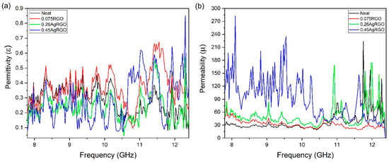 As illustrated in Figure 9, the complex permittivity and permeability properties of carbon fiber composites reinforced with RGO/AgRGO at different Ag/RGO weight ratios show considerable variation in the dielectric permittivity (ε) and magnetic permeability (μ) components over the 8–12 GHz frequency range.