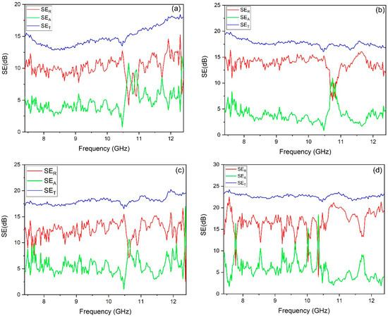 Absorption efficiency (SEA), Reflection efficiency (SER), and total shielding efficiency (SET) of (a) neat, (b) 0.075 RGO, (c) 0.26AgRGO, (d) 0.45AgRGO carbon fiber composites.