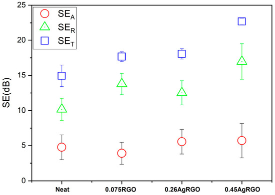 Figure 11 illustrates the mean absorption (SEA), reflection (SER), and total shielding efficiency (SET) values calculated from Equations (8)–(10), for neat, RGO/AgRGO-containing carbon fiber composites. The neat composite, in the absence of fillers, contributes to reflection efficiency with an average SER value of 10.16 dB, attributable to the presence of carbon fibers. The average SEA value in this composite is 4.7 dB, with an average SET value of 14.93 dB. The 0.26 AgRGO composite with a 2.5 w/w Ag/RGO ratio achieved an average total shielding efficiency of 18.06 dB, contributing more to absorption efficiency than the composite containing 0.075 RGO. Among the composites, the maximum SET value of 22.68 dB was achieved in the composite containing AgRGO filler with an Ag/RGO weight ratio of 5.