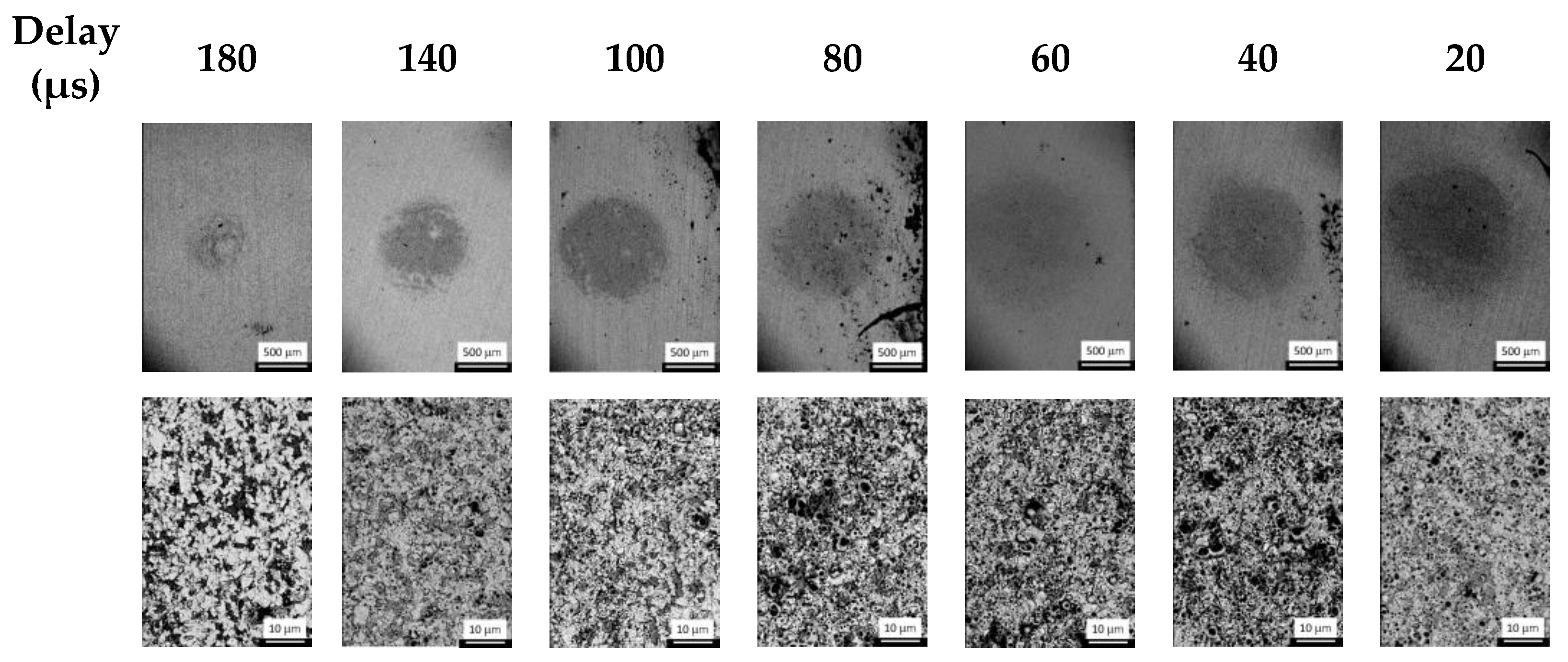 | Delay−Pulse (μs) | Measured Energy (mJ) | Transmitted Energy (mJ) | Fluence (J/cm2) |