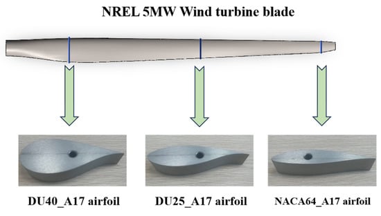 The NREL 5 MW offshore wind turbine is a key demonstration wind turbine designed by the National Renewable Energy Laboratory (NREL, USA) to promote the development of offshore wind power technology, and it has been widely used in basic research [23]. Therefore, three airfoils from the leading section, middle section, and trailing section of the NREL 5 MW offshore wind turbine blade were selected as the test models for this study, namely the NACA64_A17 airfoil, DU25_A17 airfoil, and DU40_A17 airfoil. As shown in Figure 2, the blade airfoil section has a chord length (c) of 100 mm and a spanwise thickness (r) of 20 mm, and aluminum alloy material was selected for the blade.