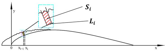 where Hi is the average thickness of the ice layer in the normal direction of the surface in the corresponding area of the chord xi−1~xi (i = 1, 2, 3…) of the blade section; Si is the ice area in the normal direction of the airfoil surface in the corresponding area of the chord xi−1~xi (i = 1, 2, 3…) of the blade section; and Li is the curve length of the airfoil surface in the corresponding area of the chord xi−1~xi (i = 1, 2, 3…) of the blade airfoil, as shown in Figure 4.