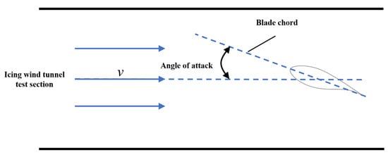 The angle of attack (AoA) refers to the angle between the chord line of the wind turbine blade and the direction of the incoming wind speed, as shown in Figure 6. Variations in the angle of attack directly affect the properties of the airflow around the blade, thereby further influencing the icing process. In this study, an icing wind tunnel was employed to investigate the effect of the blade angle of attack on the icing distribution law, and the test scheme is presented in Table 3.