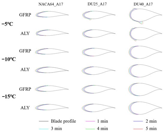 Studying the influence of different blade materials on the surface icing distribution of blades enables a better understanding of the adaptability of wind turbine blades made of different materials to icing environments, which holds guiding significance for the selection of wind turbine materials under different climatic conditions. The icing distribution processes of different blade materials at different ambient temperatures are shown in Figure 10. As can be seen from the figure, the icing areas of the blades at different ambient temperatures are concentrated at the leading edge of the blade, and with the increase in icing time, the icing amount on the blade surface increases significantly. When the ambient temperature is −5 °C, ice runback appears on the lower airfoil surface of the three airfoil blades made of GFRP; however, for aluminum alloy blades, ice runback only appears on the lower airfoil surface of the DU40_A17 airfoil, and the area of ice runback is significantly smaller than that of GFRP blades. Ice runback is formed when supercooled water droplets in the incoming flow impact the surface of the blade airfoil section but cannot freeze completely; the unfrozen supercooled water droplets then move along the lower airfoil surface under the action of gravity and gradually freeze and accumulate during the movement. When the ambient temperature decreases to −10 °C and −15 °C, the thermal conductivity rate on the surface of the blade airfoil section increases significantly, which eliminates the phenomenon of ice runback. At an ambient temperature of −10 °C, the icing profile of aluminum alloy blades is sharper than that of GFRP blades. However, when the temperature drops to −15 °C, there is no significant difference in the icing profile between the two material blades. The main reason for this phenomenon is attributed to the difference in thermal conductivity between the two materials.