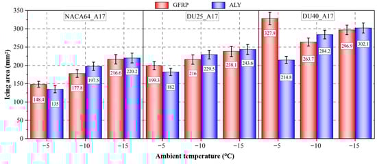 When the icing time is 5 min, the icing areas of the two blade materials at different ambient temperatures are shown in Figure 11. It can be observed from the figure that at an ambient temperature of −5 °C, the icing areas of the GFRP blades with NACA64_A17, DU25_A17, and DU40_A17 airfoils are 148.4 mm2, 199.3 mm2, and 327.9 mm2, respectively, while the icing areas of the aluminum alloy blades with the three airfoils are 135 mm2, 182 mm2, and 214.8 mm2, respectively. At this time, the icing area of GFRP blades is significantly larger than that of aluminum alloy blades. This is mainly because the thermal conductivity of GFRP is lower than that of aluminum alloy, preventing supercooled water droplets from condensing rapidly on the blade surface and thus forming ice runback. The presence of ice runback increases the windward area of the blade, allowing the surface of the blade airfoil section and the ice runback area to capture more supercooled water droplets, thereby increasing the icing area. At ambient temperatures of −10 °C and −15 °C, the icing area on the blade surface shows an increasing trend as the temperature decreases. At this time, the icing area of aluminum alloy blades is generally larger than that of GFRP blades, and the gap in icing area between the two materials gradually narrows as the temperature decreases. This is because the low-temperature environment accelerates the icing process, and more water droplets freeze on the blade surface, increasing the icing area. Meanwhile, as the ambient temperature decreases, the difference in thermal conductivity between the two materials becomes less significant at low temperatures, leading to a gradual reduction in the difference in icing area between the two material blades.