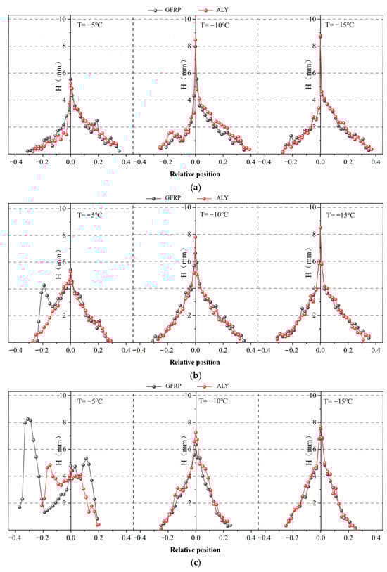 Figure 12 illustrates the influence of different blade materials on the average icing thickness. As shown in Figure 12a, at −5 °C, the maximum icing thickness at the leading edge of the NACA64_A17 airfoil GFRP blade is 5.51 mm, and ice runback is formed within the range of −19% to −15% on the lower airfoil surface. In contrast, the maximum icing thickness at the leading edge of the aluminum alloy blade is 5.22 mm, with no ice runback observed. At −10 °C, the maximum icing thicknesses at the leading edges of the GFRP and aluminum alloy blades are 7.93 mm and 8.46 mm, respectively. As the temperature further decreases to −15 °C, the maximum icing thicknesses at the leading edges of the GFRP and aluminum alloy blades increase to 8.76 mm and 8.81 mm, respectively.