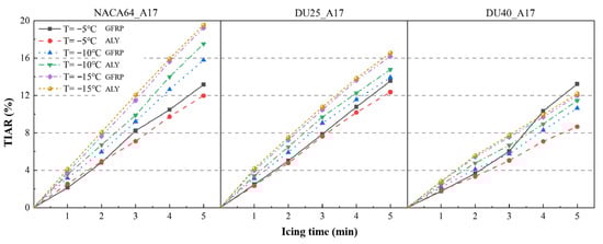 The influence of different blade materials on the TIAR of blade airfoil sections is shown in Figure 13. It can be seen from the figure that in the absence of ice runback, the TIAR of blade airfoil sections increases approximately linearly with the extension of icing time. When the icing time is 5 min and the ambient temperature is −5 °C, the TIAR of GFRP blades is higher than that of aluminum alloy blades. This is mainly due to the formation of ice runback, which increases the contact area between the blade and supercooled water droplets, thereby enhancing the blade’s icing capacity. At ambient temperatures of −10 °C and −15 °C, the TIAR of GFRP blades is lower than that of aluminum alloy blades; moreover, the lower the temperature, the closer the TIARs of the two materials become.