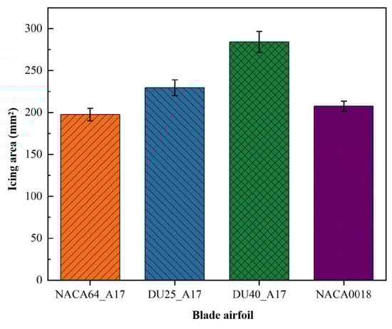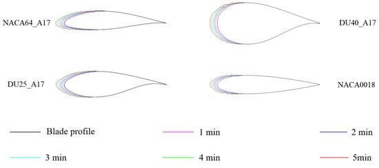 Figure 15 illustrates the influence of blade airfoils on icing area. As can be seen from the figure, the icing areas of different airfoils differ significantly under the same icing environment. At 5 min of icing, the icing areas of the NACA64_A17, DU25_A17, DU40_A17, and NACA0018 airfoils are 197.5 mm2, 229.6 mm2, 284.2 mm2, and 207.5 mm2, respectively. By comparing the geometric parameters of the four airfoils, it can be observed that the icing area exhibits a positive correlation with the maximum relative thickness of the airfoil: the larger the maximum relative thickness of the airfoil, the larger the icing area. The main reason for this phenomenon is that a larger maximum relative thickness of the airfoil results in a larger contact area with supercooled water droplets in the incoming flow, thereby increasing the probability of water droplets impinging on the airfoil surface. This increases the chances of supercooled water droplets adhering to and freezing on the airfoil surface, ultimately expanding the icing area on the blade surface.