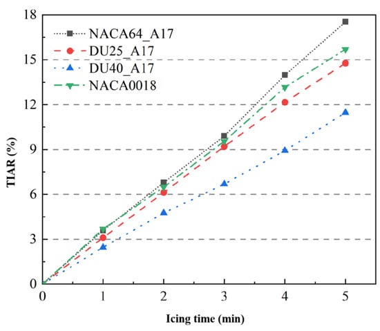 The influence of blade airfoils on TIAR is shown in Figure 17. As can be seen from the figure, when the icing time is 5 min, the TIARs of the NACA64_A17, DU25_A17, DU40_A17, and NACA0018 airfoils are 17.5%, 14.7%, 11.4%, and 15.6%, respectively. From the data, the DU40_A17 airfoil has the lowest TIAR and exhibits the strongest ice resistance capability, followed by the DU25_A17 airfoil, whose TIAR is slightly higher but still maintains good ice resistance performance; the NACA0018 airfoil ranks third in TIAR with moderate ice resistance, while the NACA64_A17 airfoil has the highest TIAR and the weakest ice resistance. It can thus be concluded that the ice resistance capability of the four airfoils, in descending order, is as follows: DU40_A17, DU25_A17, NACA0018, and NACA64_A17. By combining the geometric parameters of the airfoils and the above experimental results, it is found that the ice resistance capability of an airfoil is related to its maximum relative thickness and the relative position of this thickness. Specifically, the larger the maximum relative thickness and the closer its relative position is to the blade leading edge, the stronger the airfoil’s ice resistance capability; conversely, the weaker the ice resistance.