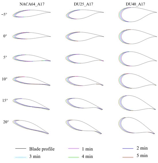Figure 22 shows the variation in lift and drag coefficients of blade airfoil sections under different icing durations. As can be seen from the figure, when the blades are ice-free, the lift coefficients of the NACA64_A17, DU25_A17, and DU40_A17 airfoils are 0.249, 0.092, and 0.415, respectively; the drag coefficients are 0.022, 0.036, and 0.108, respectively. At this stage, the three airfoils exhibit the highest lift coefficients, the lowest drag coefficients, and the optimal aerodynamic performance. With the increase in icing duration, the lift coefficients of the three airfoils all show a gradual downward trend, while the drag coefficients exhibit a gradual upward trend. When the icing duration reaches 5 min, the lift coefficients of the NACA64_A17, DU25_A17, and DU40_A17 airfoils decrease by 18%, 56.3%, and 60.1%, respectively; the drag coefficients increase by 40.9%, 22.2%, and 12%, respectively. This change indicates that icing leads to a decrease in the blade’s lift coefficient and an increase in its drag coefficient. Moreover, as the icing duration extends, the icing severity of the blades gradually intensifies, resulting in a gradual increase in the magnitude of the decrease in lift coefficient and the increase in drag coefficient.