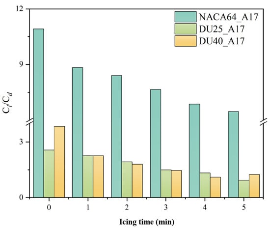 Lift–drag ratio of blade airfoil segments after icing at different icing times.