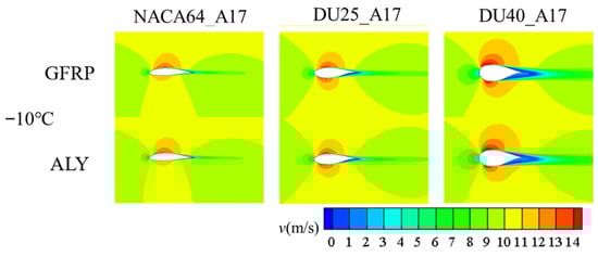 Figure 28 and Figure 29, respectively, show the pressure distribution and velocity distribution of the NACA64_A17, DU25_A17, and DU40_A17 airfoils under different blade materials after 5 min of icing. As can be seen from the pressure distribution diagrams, at an ambient temperature of −10 °C, the icing characteristics on the blade surface change and the ice layer tends to distribute uniformly. Compared to clean, ice-free blades, the pressure difference between the upper and lower airfoil surfaces of all three airfoils increases. However, at relatively low ambient temperatures, the area of the negative pressure region of aluminum alloy blades is larger than that of GFRP blades, which further confirms that aluminum alloy blades are more severely affected by icing in low-temperature environments. The velocity distribution diagram reveals the significant impact of ice runback on the flow field. After icing, large-area, low-velocity regions form on the lower airfoil surface and trailing edge region of the airfoil. At this point, the icing severity of aluminum alloy blades is more significant, the flow separation point is closer to the blade leading edge, and the aerodynamic performance deteriorates more noticeably.