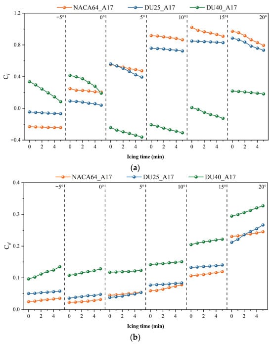 Lift–drag coefficients of blade airfoil segments after icing at different icing times. (a) Lift coefficients. (b) drag coefficients.