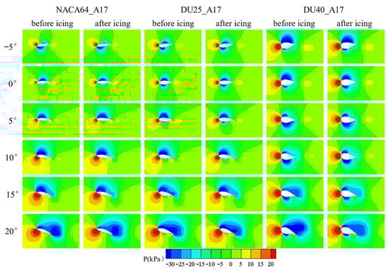 Figure 32 and Figure 33, respectively, show the pressure distribution and velocity distribution of the three airfoils before and after icing under different angles of attack. From the pressure distribution diagrams, it can be observed that the variation in the blade angle of attack significantly affects the position and distribution of positive and negative pressure regions on the blade surface. As the angle of attack gradually increases, the area of the positive pressure region on the lower airfoil surface expands continuously; in contrast, the negative pressure region on the upper airfoil surface gradually extends from being distributed only near the leading edge to covering the entire airfoil surface. Such changes in positive and negative pressure regions directly affect the lift and drag characteristics of the blade. At small angles of attack, the local negative pressure at the leading edge is the main source of lift; as the angle of attack increases, the negative pressure region extends backward, further increasing the lift. However, when the angle of attack continues to increase, flow separation may occur on the upper airfoil surface, leading to irregular expansion of the negative pressure region and a slowdown or even decrease in lift growth. L. Gao et al. demonstrated that ice layer structures at different attack angles can cause severe airflow separation, thereby affecting blade aerodynamic performance, which is identical to the findings of this study [29]. Meanwhile, the increase in positive pressure on the lower airfoil surface may cause an increase in drag, disrupting the aerodynamic balance of the blade. When icing occurs on the blade, ice protrusions alter the airflow attachment state. On the upper airfoil surface, icing expands the coverage of the negative pressure region, but the intensity of the negative pressure is significantly reduced—this means that although the range of the negative pressure region increases, the actual lift-generating effect decreases. On the lower airfoil surface, icing forms local high-pressure regions, particularly at the ice protrusions. These high-pressure regions increase pressure drag, further deteriorating the blade’s aerodynamic performance. From the velocity distribution diagrams, it can be seen that at small angles of attack, the airflow distribution around the blade airfoil is relatively stable, with no obvious flow separation; the low-velocity region on the blade surface is relatively small. As the angle of attack increases, the airflow at the blade trailing edge gradually detaches from the surface, forming obvious flow separation. This leads to an expansion of the low-velocity region at the airfoil trailing edge and a decline in aerodynamic performance. When icing occurs, the ice layer on the blade surface destroys the original smooth aerodynamic profile, forming irregular protrusions and rough surfaces. These irregular structures cause airflow to separate earlier on the blade surface, especially near the leading edge and mid-airfoil section. The presence of the ice layer not only significantly expands the range of flow separation but also extends the low-velocity region toward the front of the airfoil, resulting in a further decrease in lift and a significant increase in drag. In summary, icing significantly intensifies the flow separation effect caused by increasing angles of attack, leading to more severe deterioration of the blade’s aerodynamic performance.