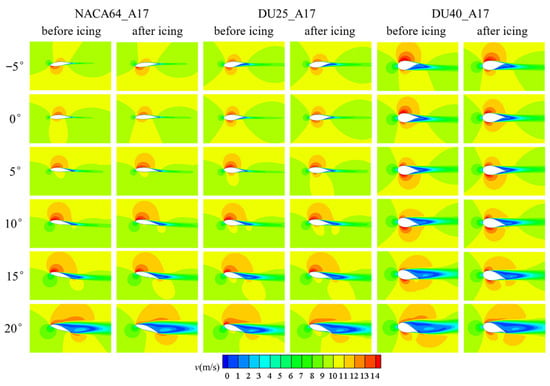 Velocity distribution of blade airfoil segments after icing at different angles of attack.